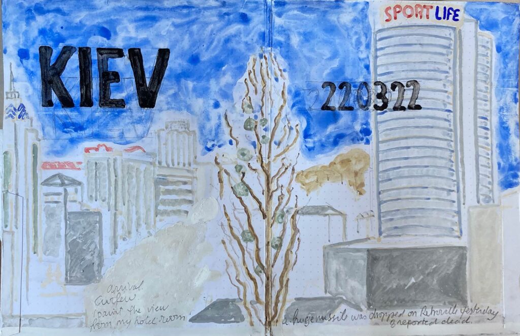 The streets are deserted. There are lots and lots of defence posts. The tension is very high. The front is at 25 kilometers form the city center, near Irpin. The Russians are throwing bombs on civilian areas in Kiyv. Yesterday a big missile was dropped on a shopping mall in Retroville. Eight people are reported dead. The mayor called a curfew for 24 hours, till tomorrow morning 8 AM. Nobody is allowed out on the street. I find a hotel, which is empty, except for a handful of journalists. I spend the day in my hotel. I draw the view from my room. The heavy thumps from the front are audible constantly, the pressure of the blasts makes make my window shake at times.