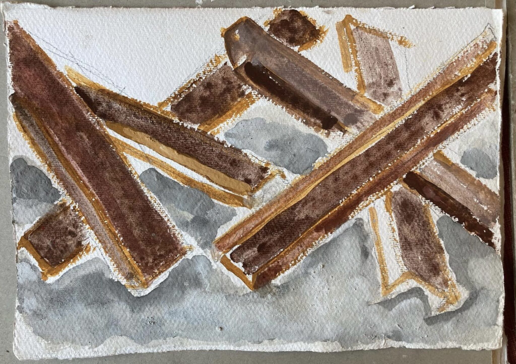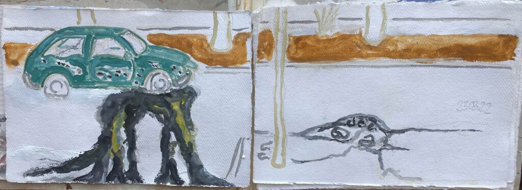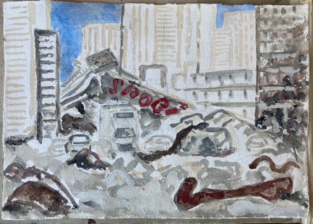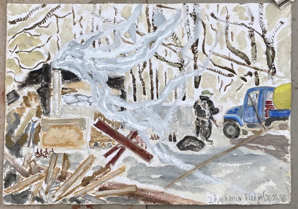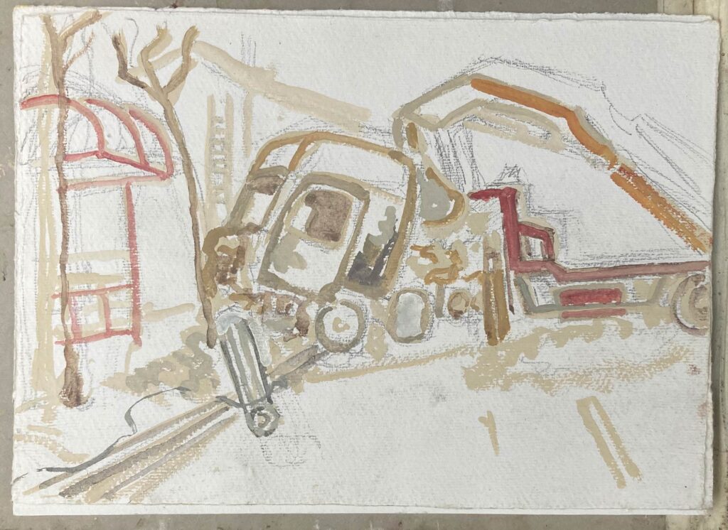 230322 I go to Retroville, it is a 20 minutes drive from my hotel to the north-west of the city. It is closer to the front. The sounds from the front are louder here. I go to the place where the missile was dropped close to a shopping mall. The damage is enormous. The debris extend over hundreds of meters. It was the biggest Russian missile launched on Kyiv so far. I paint the scene. I am not allowed to go very close because there are still unexploded parts of the missile lying around a soldier tells.