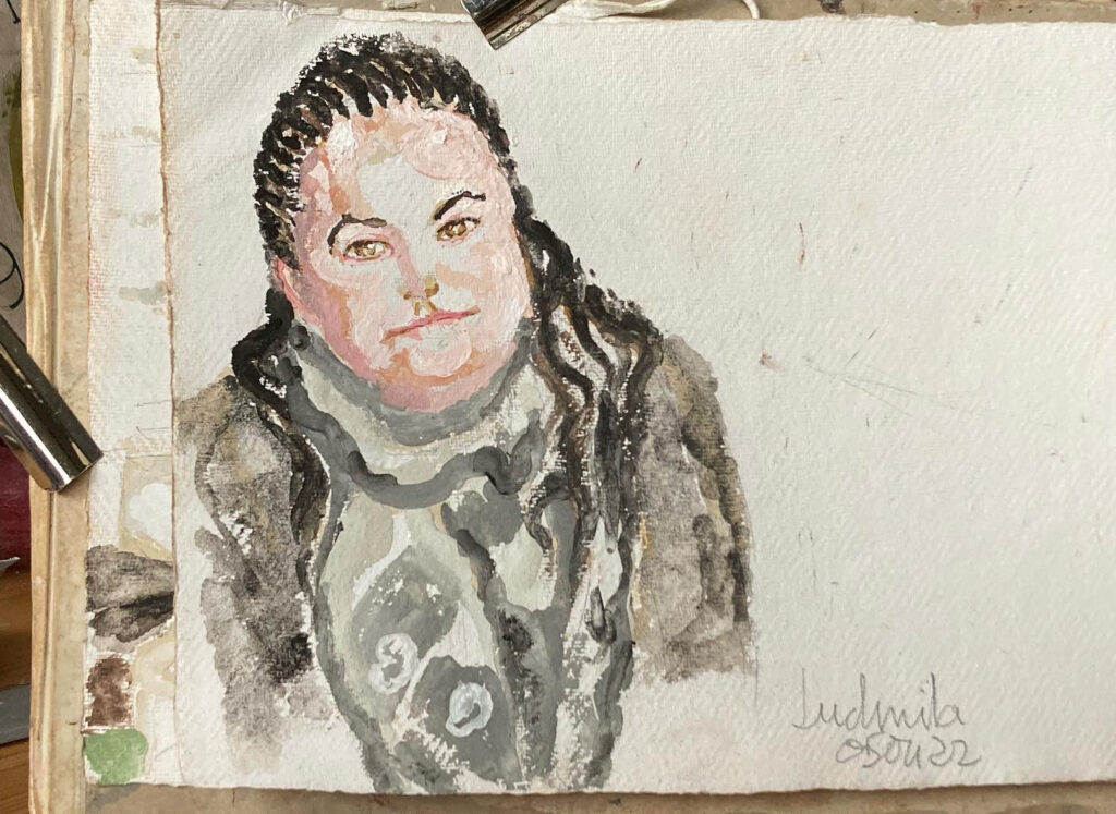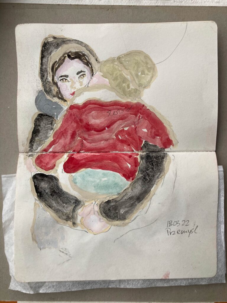 My first drawing is of this girl and the sibling, she is carrying in her arms. She belongs to a family that is going back into Ukraine. They are waiting on the same platform as I do for a train to Lviv. I draw them on the platform, while waiting.