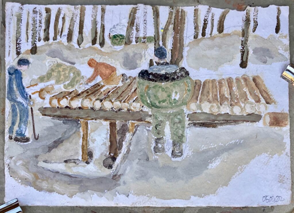 It’s cold, Oleksiy’s is cutting wood for the wood stoves of the block post.
