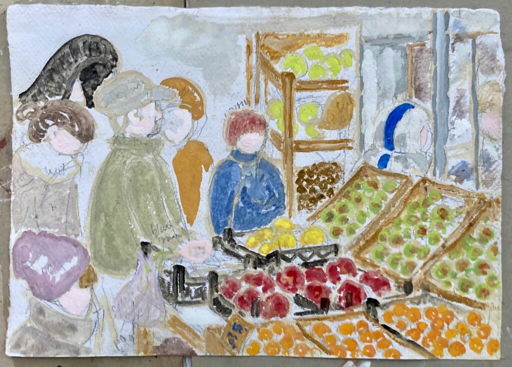 The district was hit several times. I draw a truck and bus station destroyed during a previous attack. The contrasts are huge. On the one hand there is death and destruction, and on the other hand, people carry on living. Nearly everything is closed in Kyiv, but on the main road in Poznyak, a vegetable kiosk is open, and the fruit looks good.