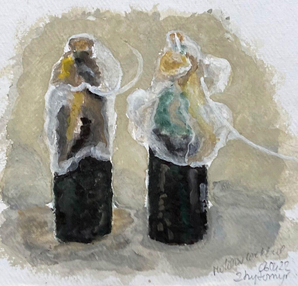 060422 In case you had forgotten how they look like: the Molotov cocktail. They have dozens of them at the block post. They will not stop cruise missiles, but can create a lot of mayhem. Dark, greasy, non-descript bottles, probably more difficult to paint than to make.