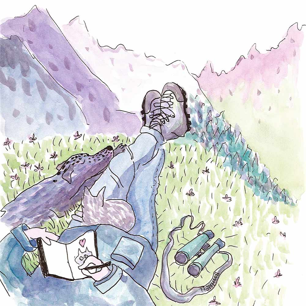 Florence Debove is a shepherd in the Pyrenees. She draws sketchbooks in situ : vast landscapes, herds of sheeps, isolated houses, the dance of clouds. The atmospheres are punctuated by writings, texts inspired by her life with animals and the mountains. She mixes techniques, marker, colored pencils, chalk, watercolor, gouache. In 2021, she published her notebooks : "Bergère", edited by Transboréal.