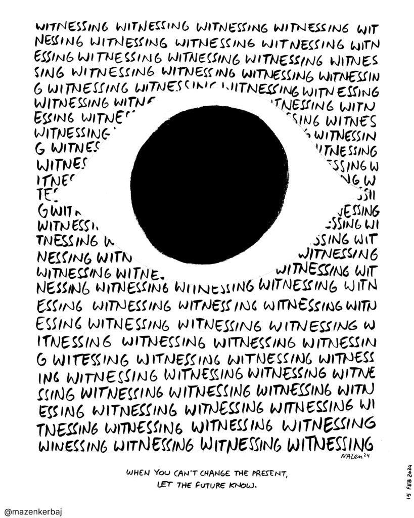 When the war broke out in Gaza he felt the urge to draw. When he saw an image of a father carrying the remains of his child in a garbage bag, he decided to fight back with drawing. This fighting mode for him is not meant for winning the war, it is just that he has to do it in order to save at least himself. To not go insane. It prevents him from getting depressed. He says: “I am satisfied when I do a good drawing and I feel depressed that I am satisfied about a drawing of something this awful. And if I stop drawing, I am even more depressed. What we are witnessing and dealing with has changed each and every aspect of our lives. Forever.” It feels right that he can do something to raise awareness of the situation. Responses from people help him to cope with the situation. He notices that people all over the world get on the street to protest and stand with Palestine. The supremacy of the United States and the old white world, who always have Israel’s back, is no longer obvious. In the first months after the war started, he posted drawings every day and shared them on social media, encouraging people to reproduce them and use them in demonstrations or on the walls of their cities. In the past month, he has stopped making drawings about Gaza. “I feel I have nothing more to say than to repeat the same things”, he says. “I don’t want to pity the Gazan people” he says. “When I am optimistic, I think things will get better. The cost is very high, but the result may be that the situation in Palestine will get better. A lot of people, especially young people, all over the world get on the streets to protest and show that this cannot be tolerated any longer. The world is finally aware of Palestine again. It is impossible to go back to how things were before.”