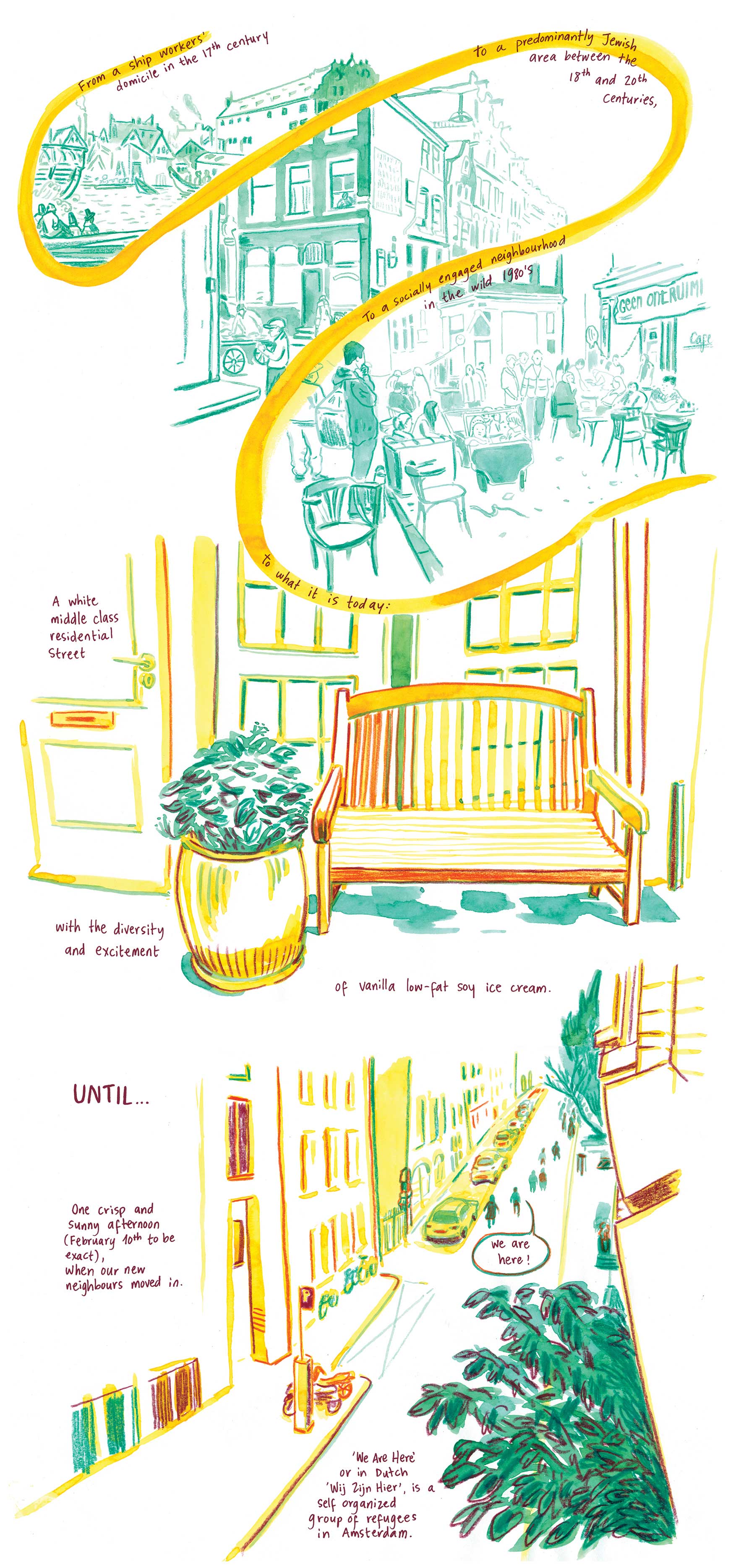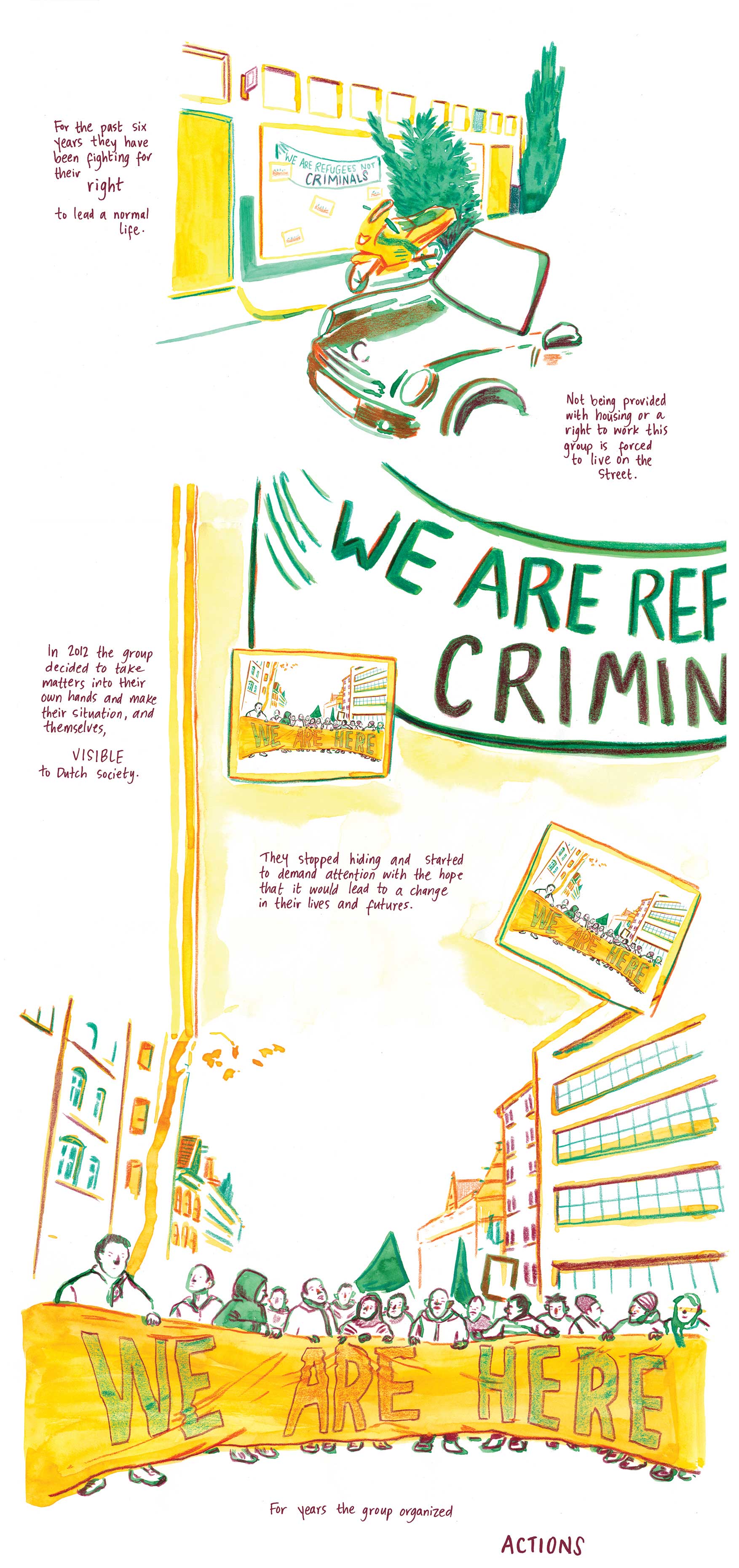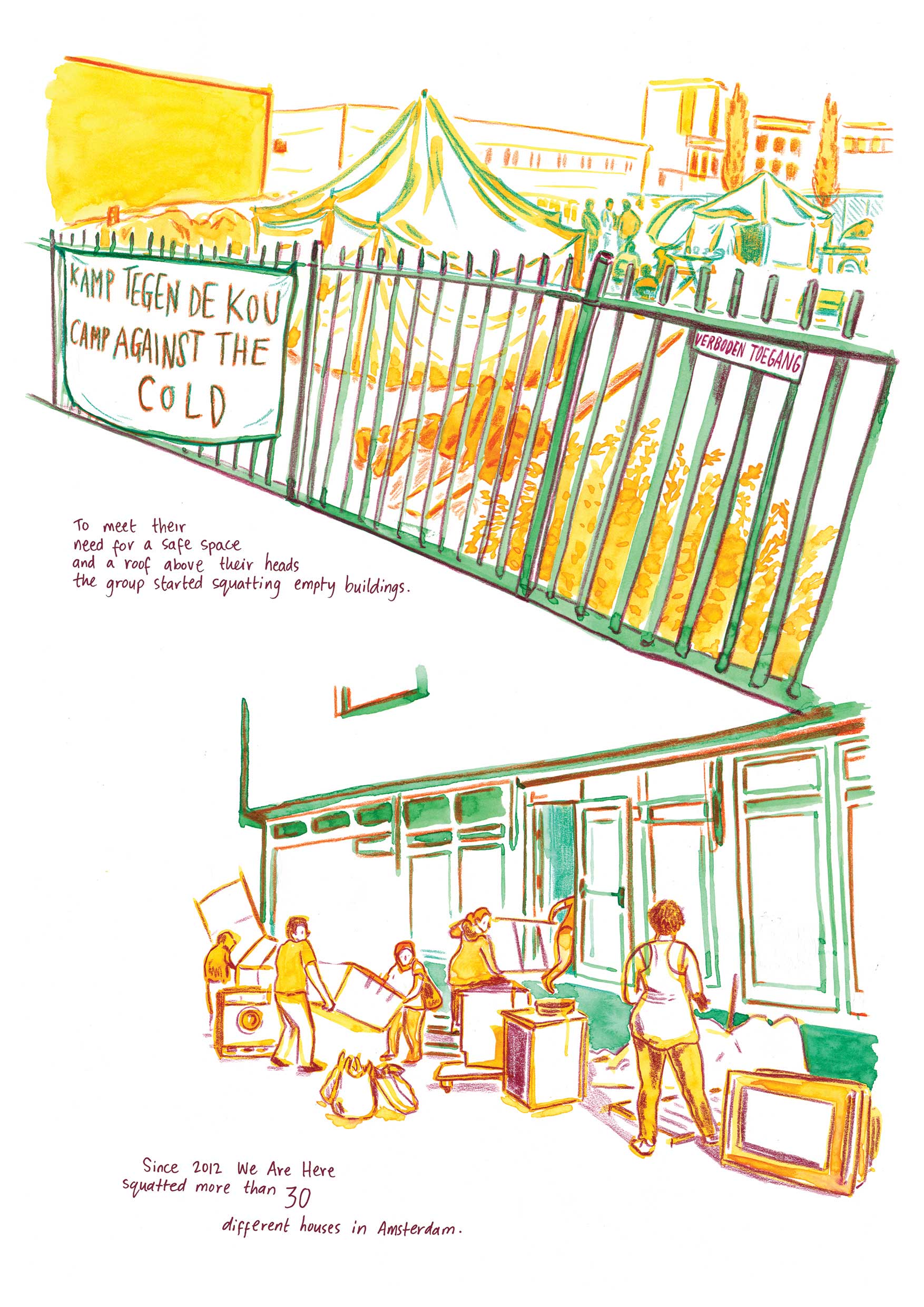 On a sunny Saturday in February a house is squatted on a quiet street in the center of Amsterdam. The new neighbours are a part of We Are Here, a group of refugees fighting for their right to lead a normal life and to be seen by Dutch society. This story follows the group and their time at the house on the Rapenburg.