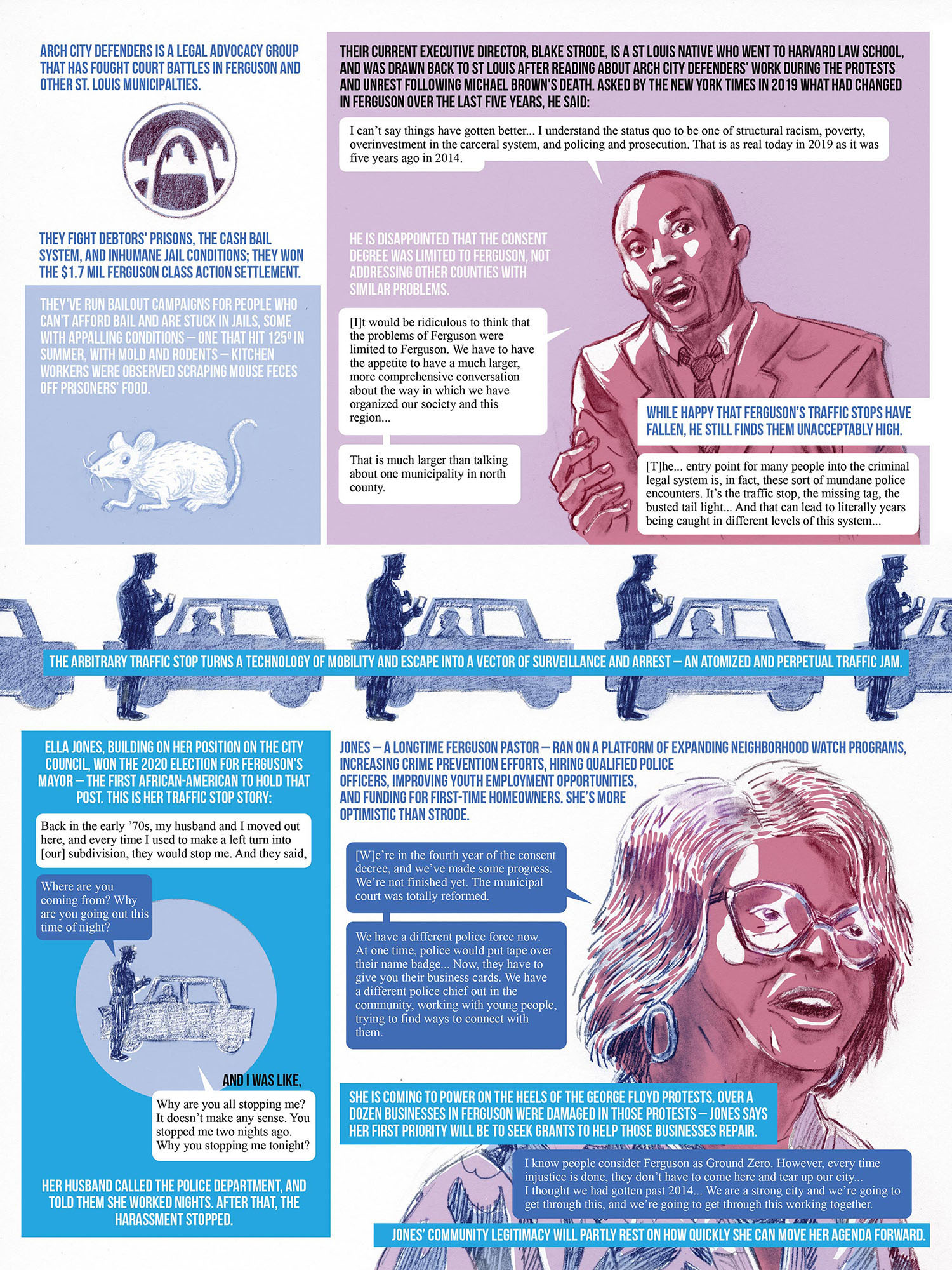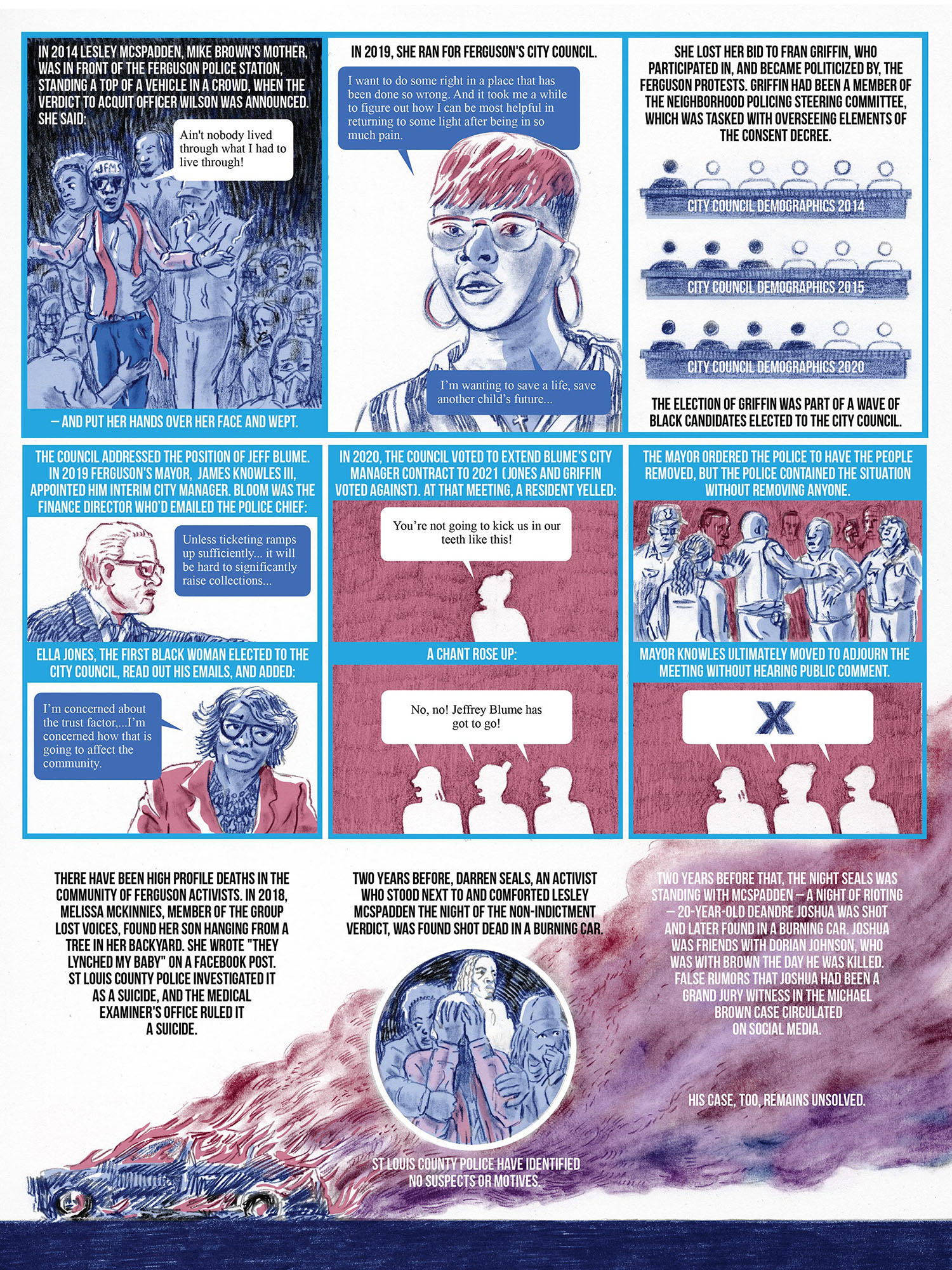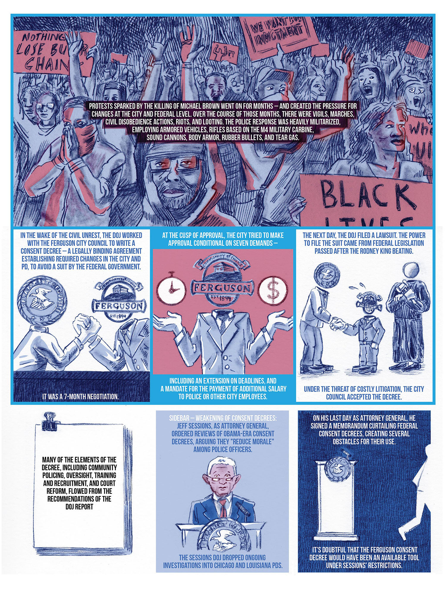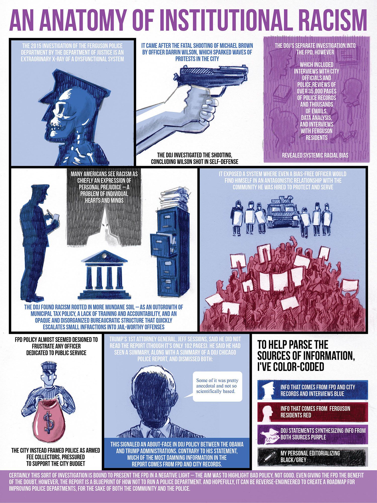 A longstanding defense of American policing is that, when an officer is caught abusing their power, it can be explained away as the problem of "one bad apple" – in other words, it's the fault of an individual corrupt officer. The investigation of the Ferguson, Missouri Police Department, conducted by the Department of Justice (DOJ) after the fatal police shooting of 18-year-old Michael Brown, painted a very different picture. The DOJ report revealed, in painstaking detail, the way policies and procedures in the department created racist outcomes and abuses of power. It's a microcosm of the way policing can go wrong, from the criminalization of poverty to the unchecked use of excessive force. Chris Lanier created this comic adaptation of the Ferguson DOJ report in an attempt to make the idea of "institutional racism" both concrete and accessible. It also illustrates how the report was used in Ferguson over the past six years – reviewing the successes and failures of the movement for change. In that story are lessons and cautionary tales for the current movement for police reform in the US, spurred by the on-camera police killing of George Floyd in Minneapolis, Minnesota. This comic can be downloaded as a single, multi-page PDF at this link. A bibliography of linked sources for the comic can be downloaded here.