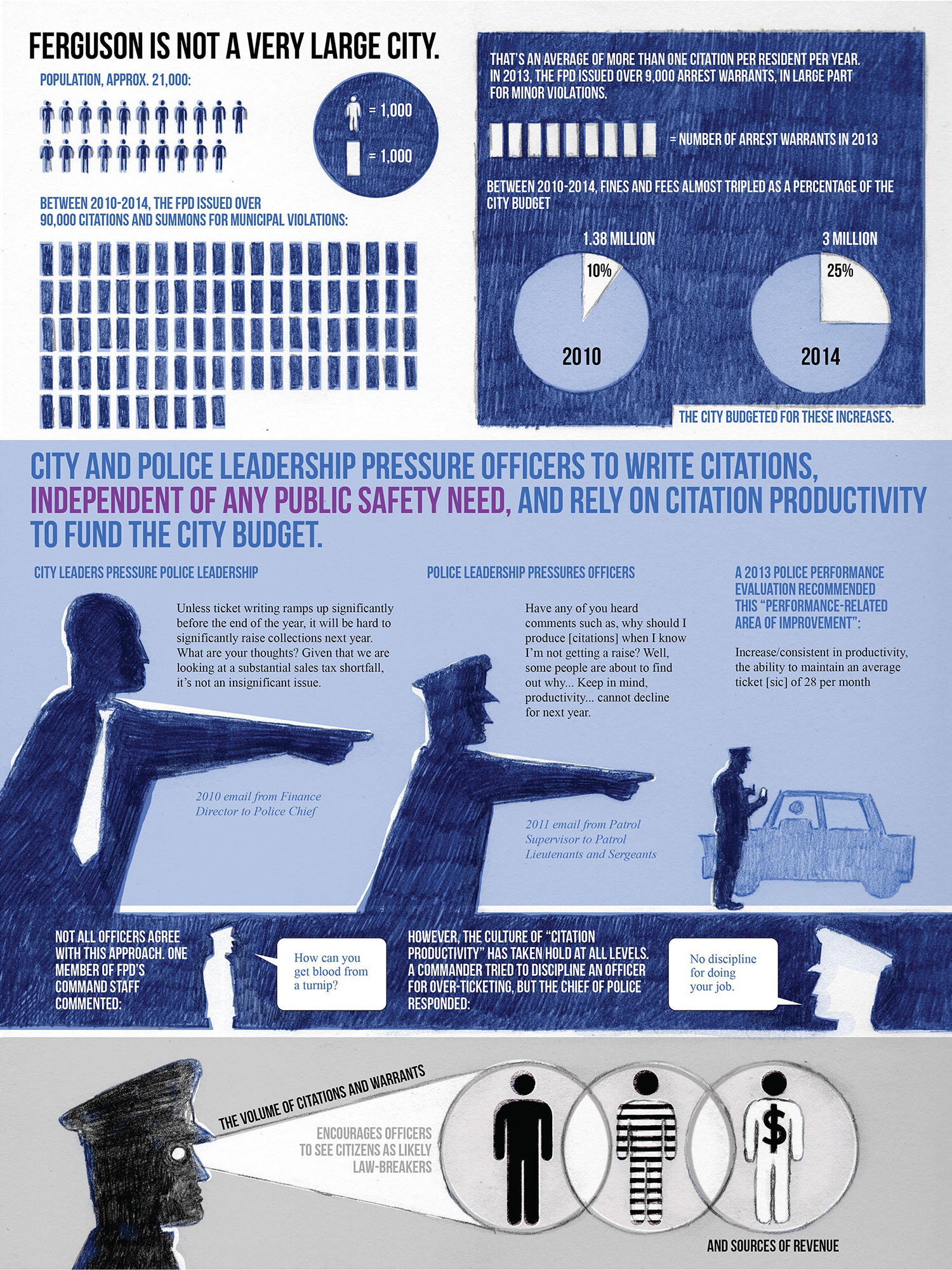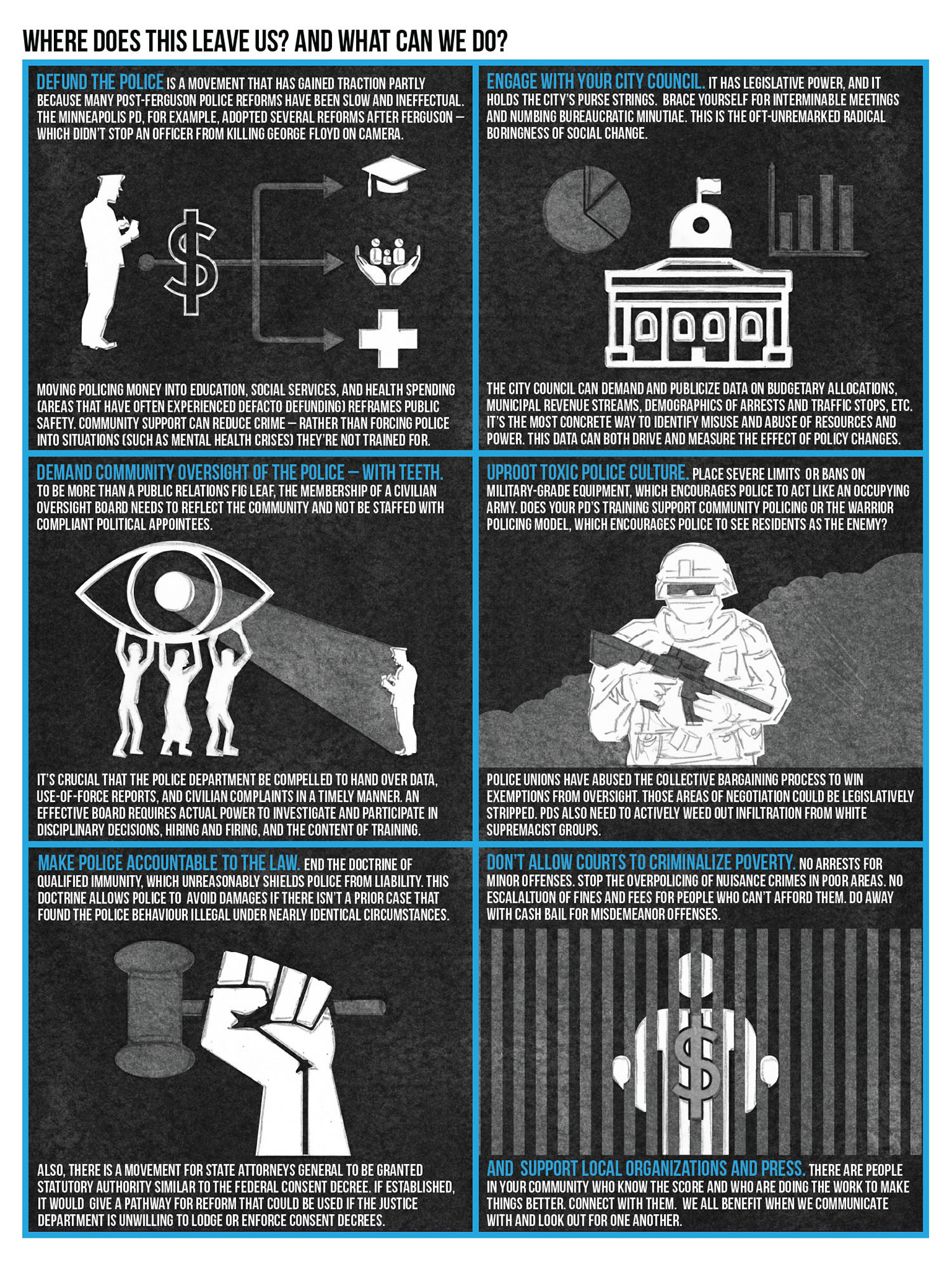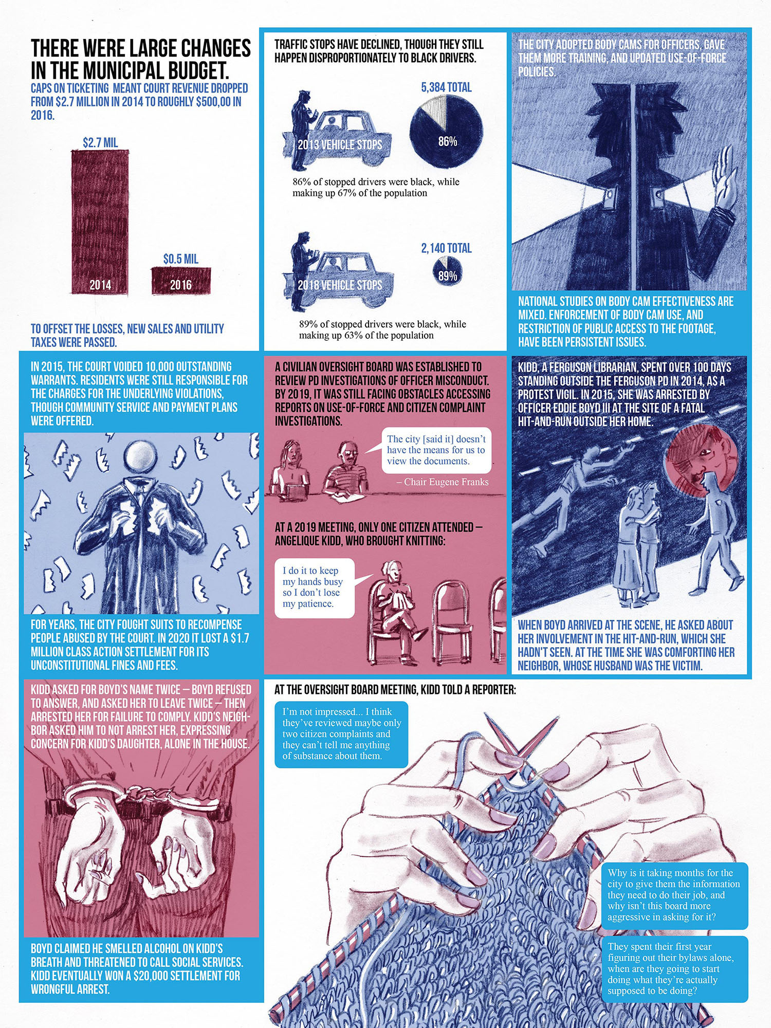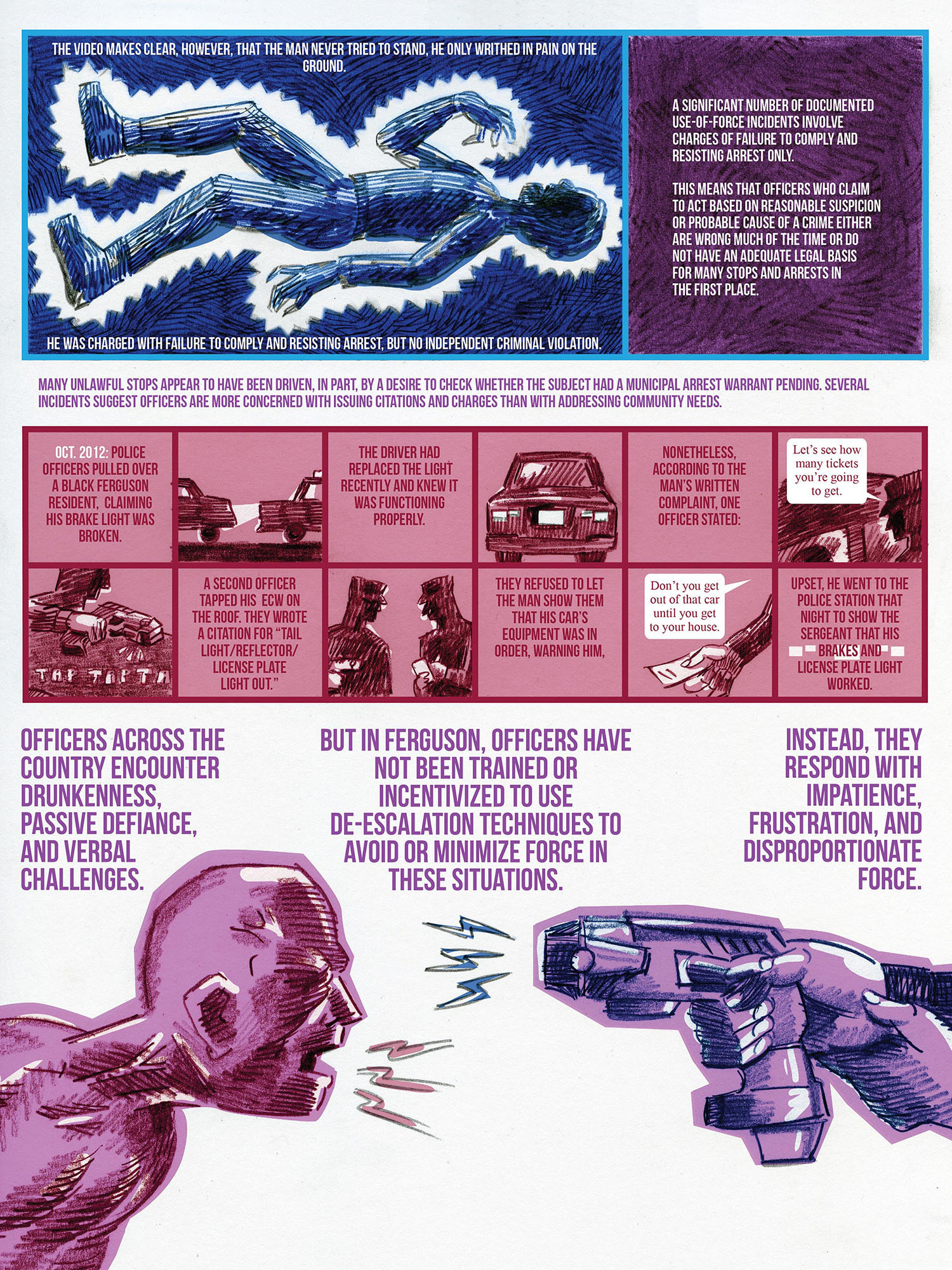 A longstanding defense of American policing is that, when an officer is caught abusing their power, it can be explained away as the problem of "one bad apple" – in other words, it's the fault of an individual corrupt officer. The investigation of the Ferguson, Missouri Police Department, conducted by the Department of Justice (DOJ) after the fatal police shooting of 18-year-old Michael Brown, painted a very different picture. The DOJ report revealed, in painstaking detail, the way policies and procedures in the department created racist outcomes and abuses of power. It's a microcosm of the way policing can go wrong, from the criminalization of poverty to the unchecked use of excessive force. Chris Lanier created this comic adaptation of the Ferguson DOJ report in an attempt to make the idea of "institutional racism" both concrete and accessible. It also illustrates how the report was used in Ferguson over the past six years – reviewing the successes and failures of the movement for change. In that story are lessons and cautionary tales for the current movement for police reform in the US, spurred by the on-camera police killing of George Floyd in Minneapolis, Minnesota. This comic can be downloaded as a single, multi-page PDF at this link. A bibliography of linked sources for the comic can be downloaded here.