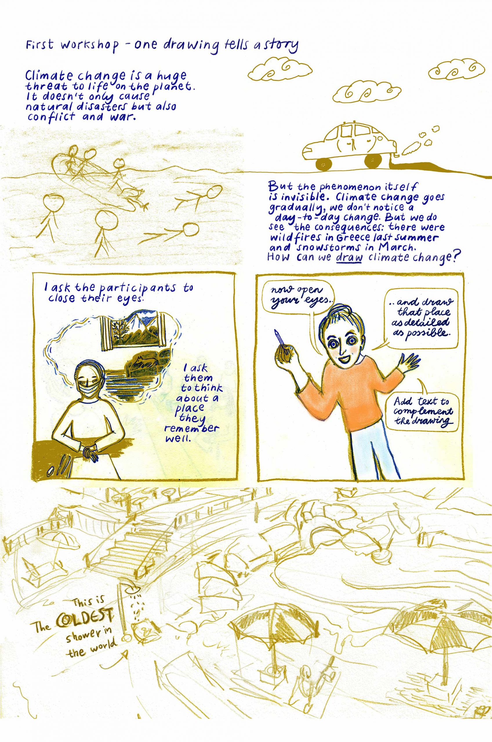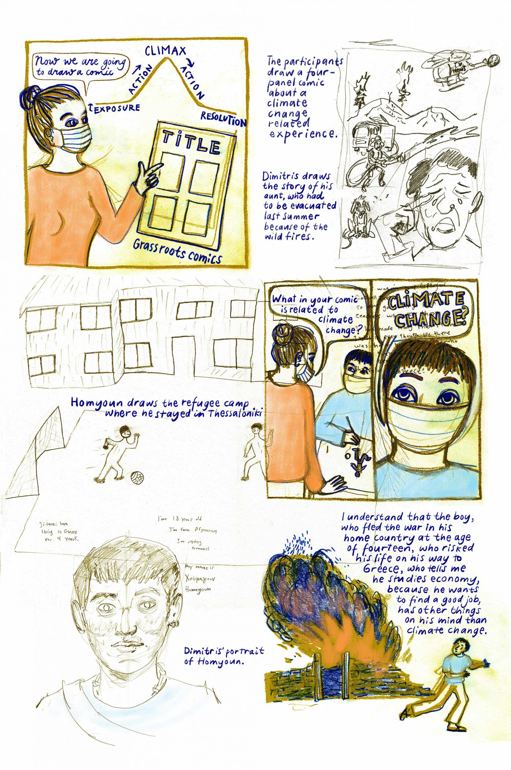 Eva Hilhorst was invited to this year's Comicdom Con in Athens, to host a series of workshops about comics and climate migration for young Greeks and refugees. For four days the participants were drawing comics. A lot of different stories emerged on the paper, all of them related to climate change somehow. Those stories also made clear that it is a privilege to be able to worry about climate change. Fridays For Future may not be top priority on Saturdays for some of the activists, but kids that are fleeing war cannot choose to take a break. What the stories also made clear was that drawing is a beautiful language to talk about experiences, fears and hopes. The workshop was organised by Athens Comics Library and Comicdom Con, in the framework of the Climate of Change program funded by the EU DEAR (Development Education and Awareness Raising) programme.
