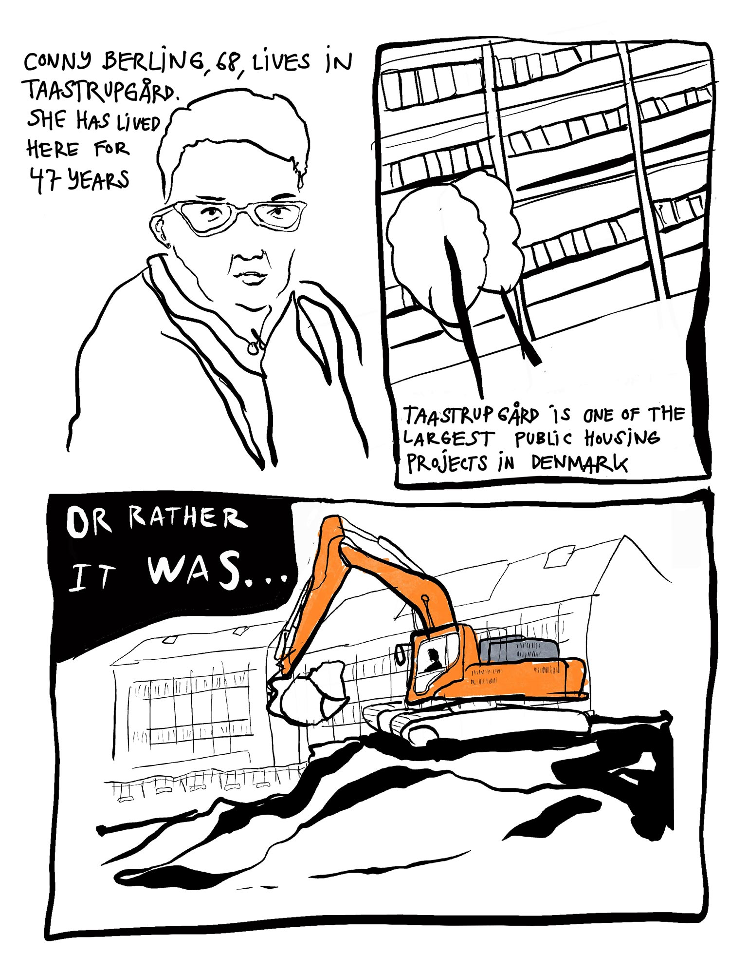 The public housing projects in the danish suburbs were cornerstones of the famous welfare state. But since the 1970’ies, these concrete utopias have met more problems than any of their founders could have imagined. Today the areas are undergoing a dramatic demolition process with the aim of getting rid of ghetto problems in the country. Jakob Fälling set out to document the demolition and communicate the place from the inhabitants’ perspective. Conny Berling is a former sandwich maiden. She has lived in one of these housing projects since 1973. (… and ”smørrebrød” is a traditional danish sandwich dish).