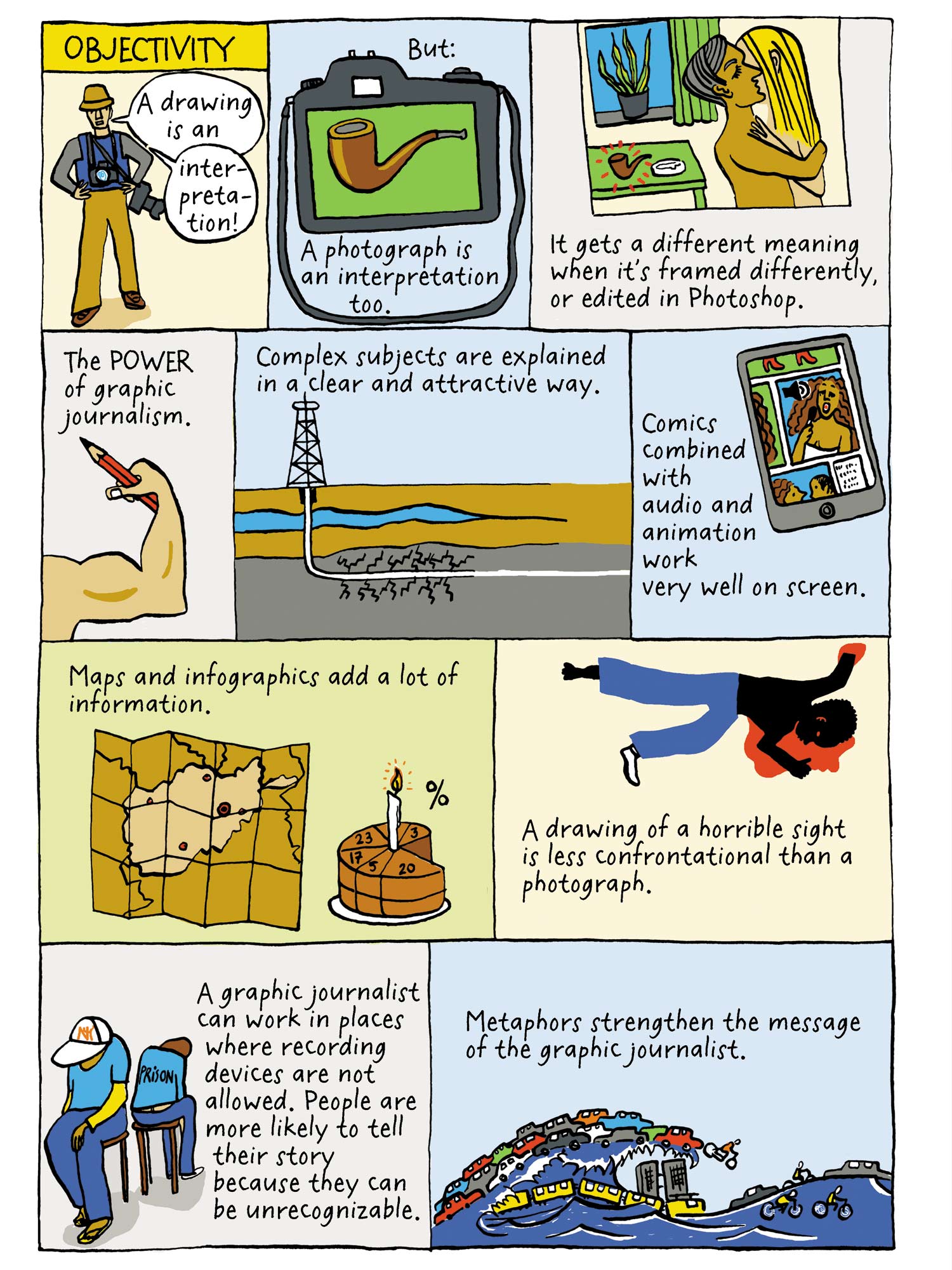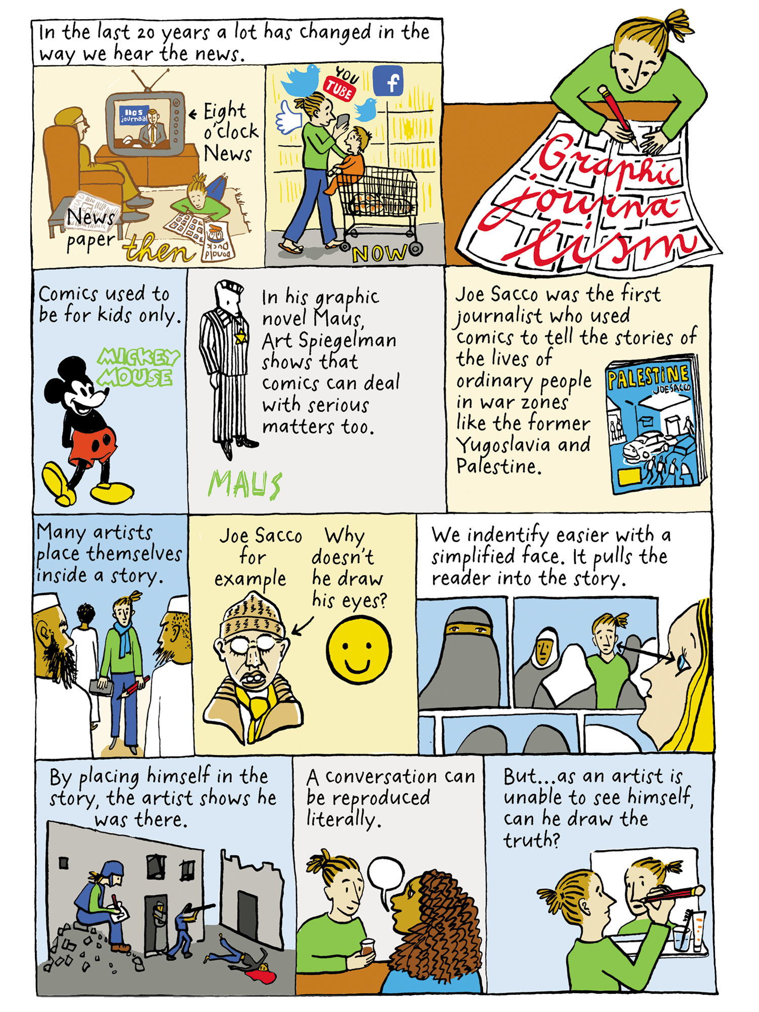 Eva Hilhorst made this comic as an introduction to the exhibition Strip-journalistiek in the persmuseum in Amsterdam in 2014 and 2015. It was translated into French and Portuguese for the magazine Courrier International.