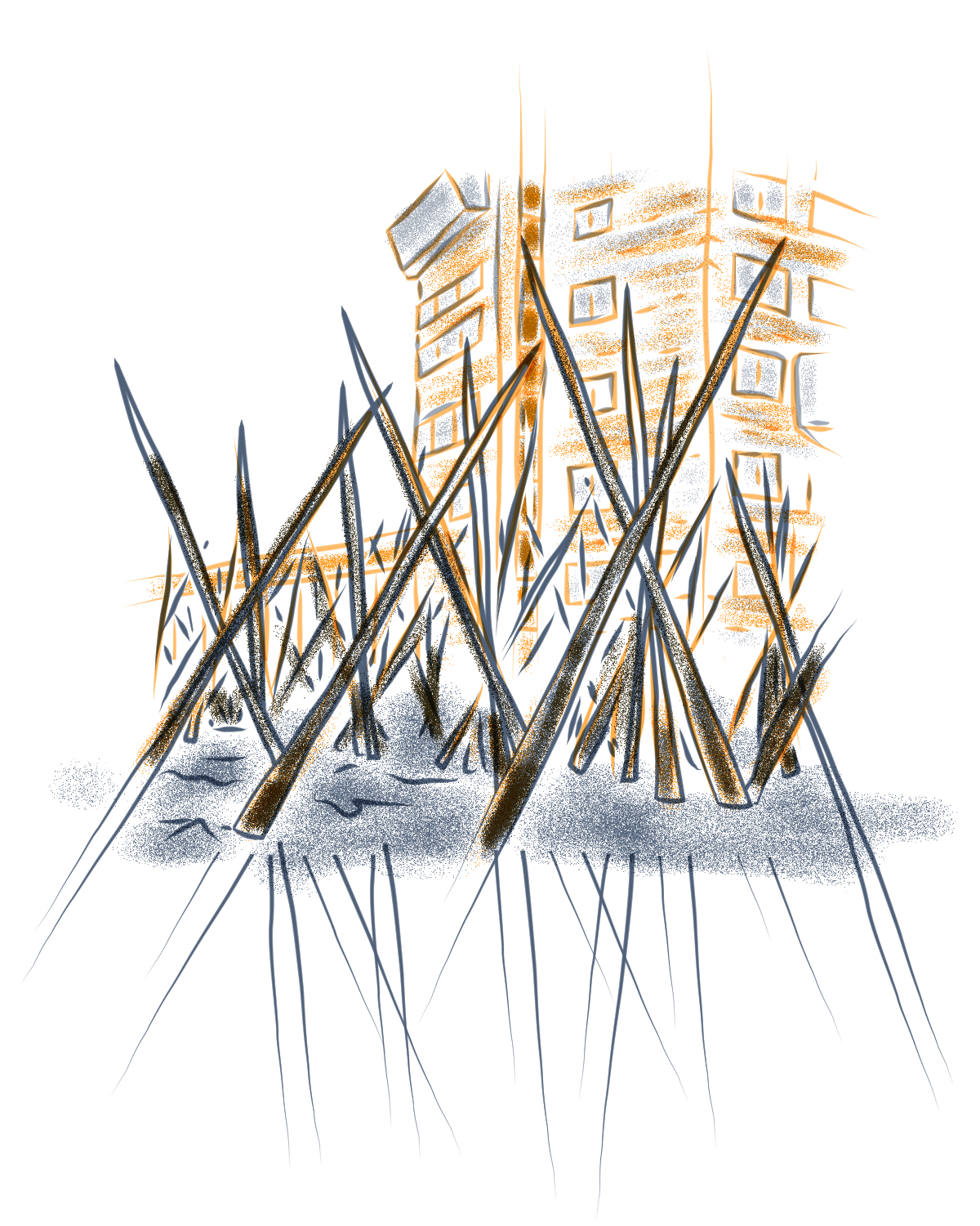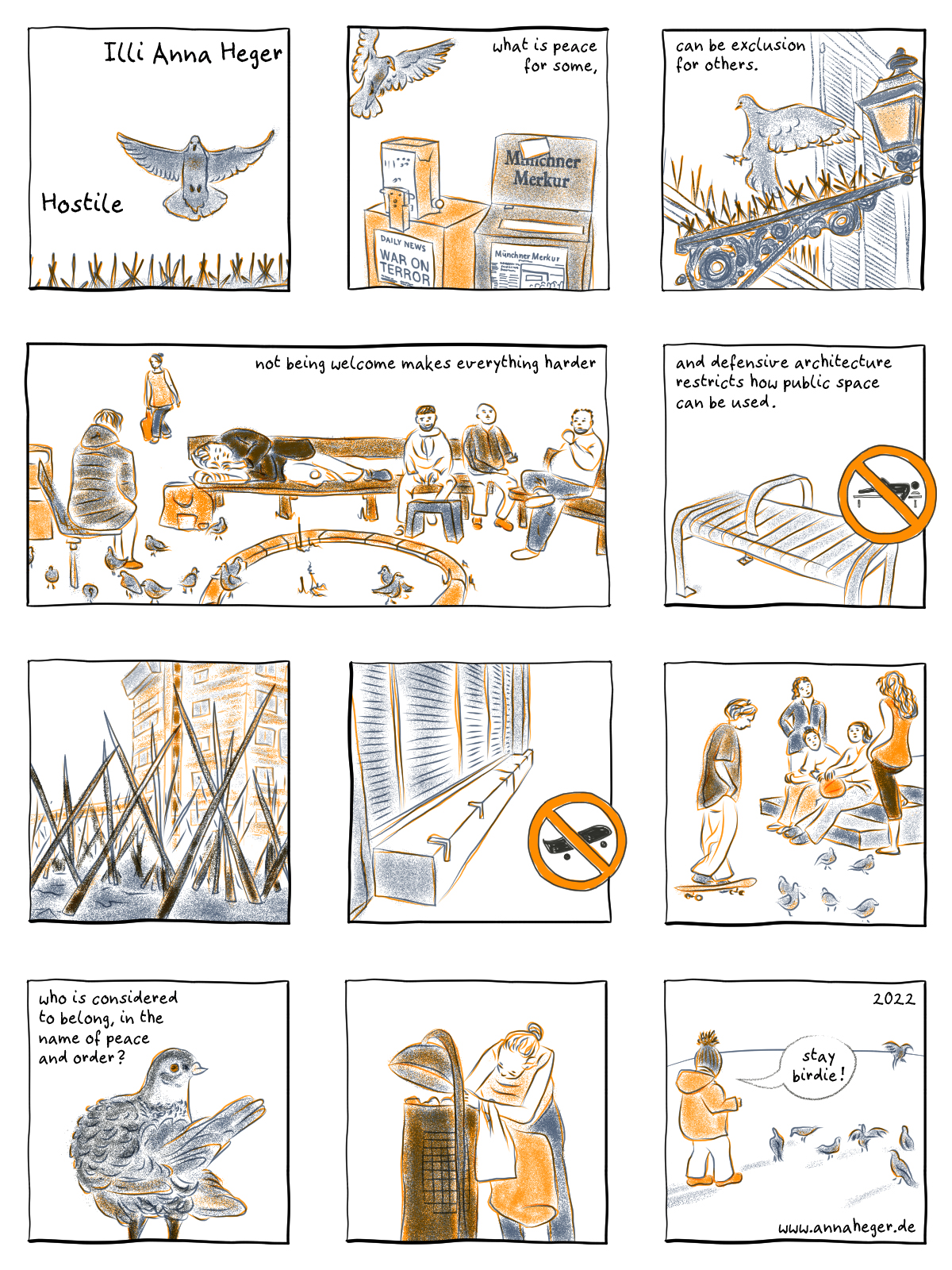 Hostile Minicomic 23 The one page comic consists of 11 panels, digitally drawn in orange and indigo on white. All text is hand-written font, including the title on the first panel. 1) A pigeon with wide spread wings is hovering over spiky anti-pigeon fence on a wall. 2) The pigeon flies to two boxes distributing papers, one of the papers attached to the box reads »War on terror« in the Daily News. The other box belongs to the Münchner Merkur, the cover with print too small to read. Text in the right upper corner: »what is peace for some« 3) Text continues in the left upper corner: »can be exclusion for others.« The pigeon is kept from landing on a old fashioned street light attached to a house, by the by large spikes on top of its wrought-iron mounting. 4) Several people sit on public benches around an empty circular flower bed. A person in a down jacket sits alone on a bench next to a trashcan,surrounded by a flock of pigeons. On the left of a long bench somebody with a dark jacket is sleeping with the head on their belongings. On the other side three people talk to each other. In the distance another person passes carrying a bright orange shopping bag. Text above: »not being welcome makes everything harder«. 5) Text continues in the left upper corner: »and defensive architecture restricts how public space can be used!« Below a bench that as an armrest right across the middle. An orange warning sign with an crossed out icon of a person lying down is overlayed. 6) Behind the close-up of anti-pigeon spikes an apartment with many windows is depicted. 7) The facade of an office building, to the benches in front, anti-skateboard elements are fastened. An orange warning sign with a crossed out skateboard is overlayed. 8) A group of teenagers sitting and standing outside on stairs chatting. A persons with long curly hair sits and holds a basketball. At the bottom of the stairs another teenager with baggy pants moves their skateboard back and forth. They are surrounded by a flock of pigeons. 9) Close up of a pigeon that ruffles up their feathers and turns to look at us. Text above: »who is considered to belong, in the name of peace and order?«. 10) The person from earlier with the orange shopping bag is rummaging through trash in a trash can and puts things into a white plastic bag. 11) A small child is feeding pigeons and calls out to one of them for flying off: »Stay birdie!«