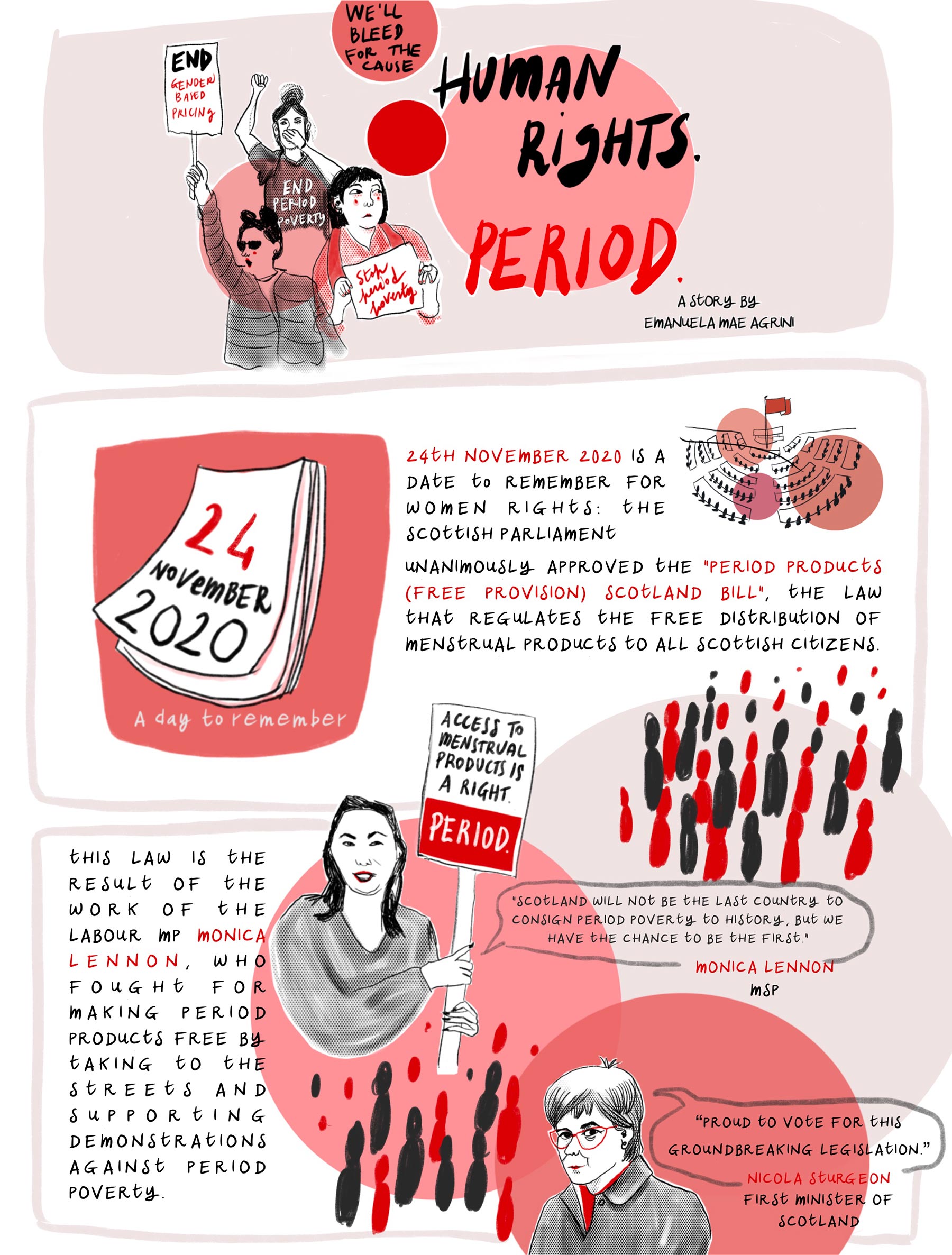 On November 24, 2020 the Scottish Parliament unanimously passed a law that makes menstrual products free for Scottish citizens. However, this good news reminds us that around the world half of the population has to deal with the stigma of menstruation and issues such as period poverty. Period right is a human right, and we have to take action if we want to live in a world where the word "equality" has real meaning.