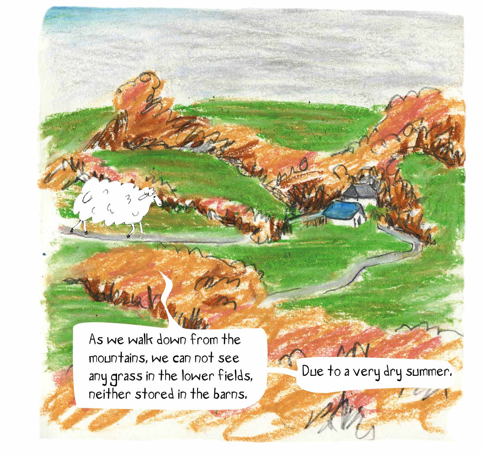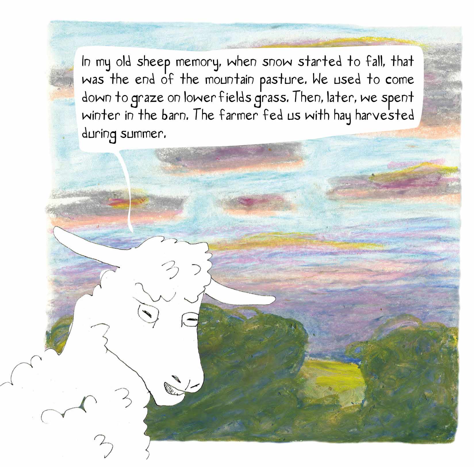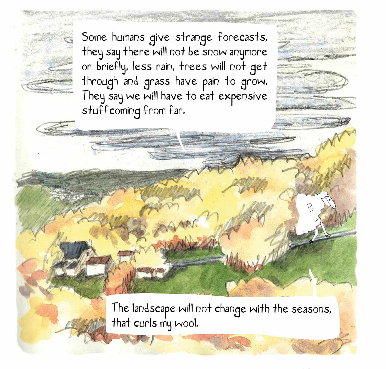 Florence Debove and Barbara Le Pors are two shepherdess. Florence draws landscapes and sheep, Barbara gets inspired and begins writing a story. Together they bring to life an old sheep recounting her memory of the climate.