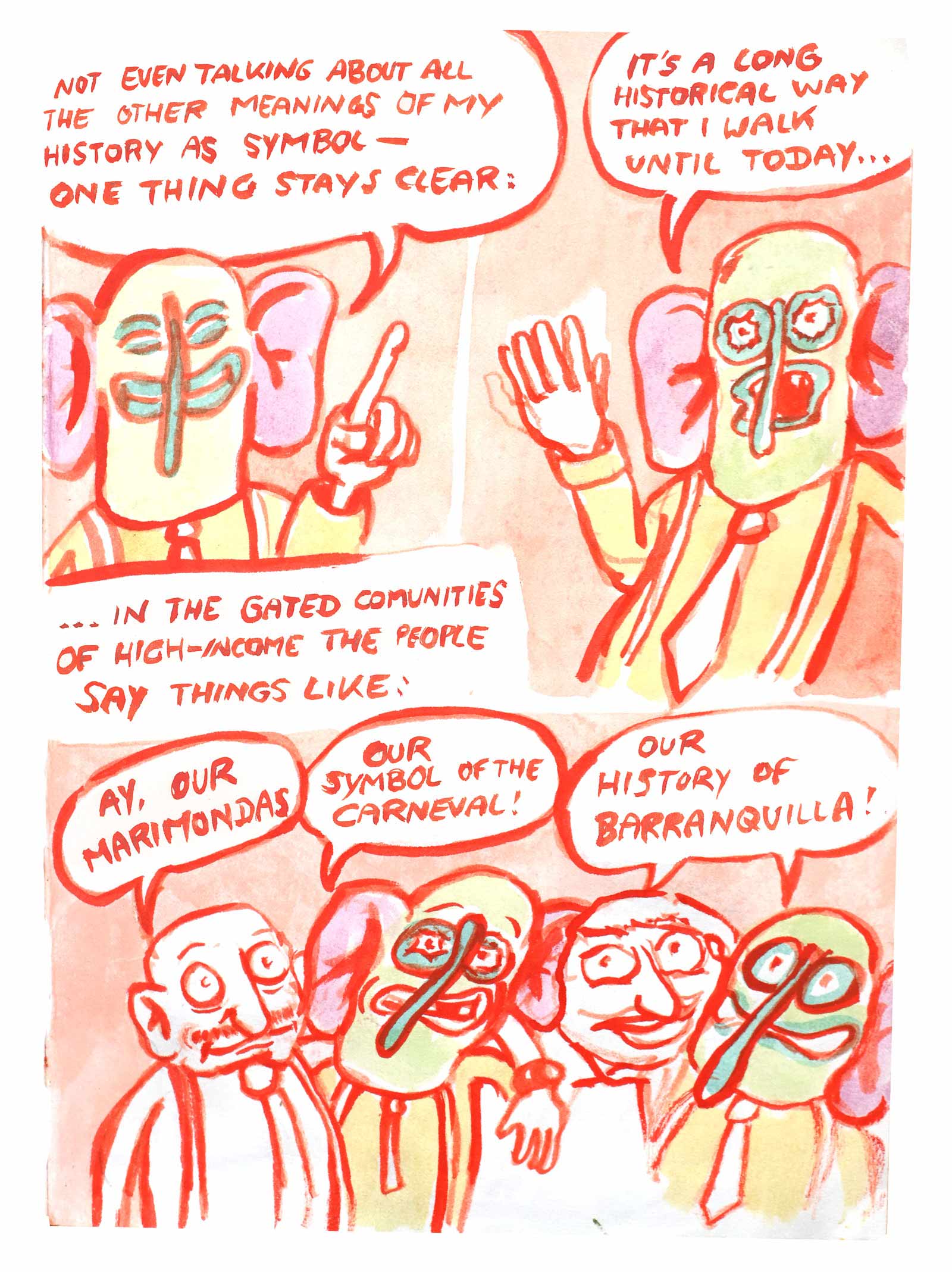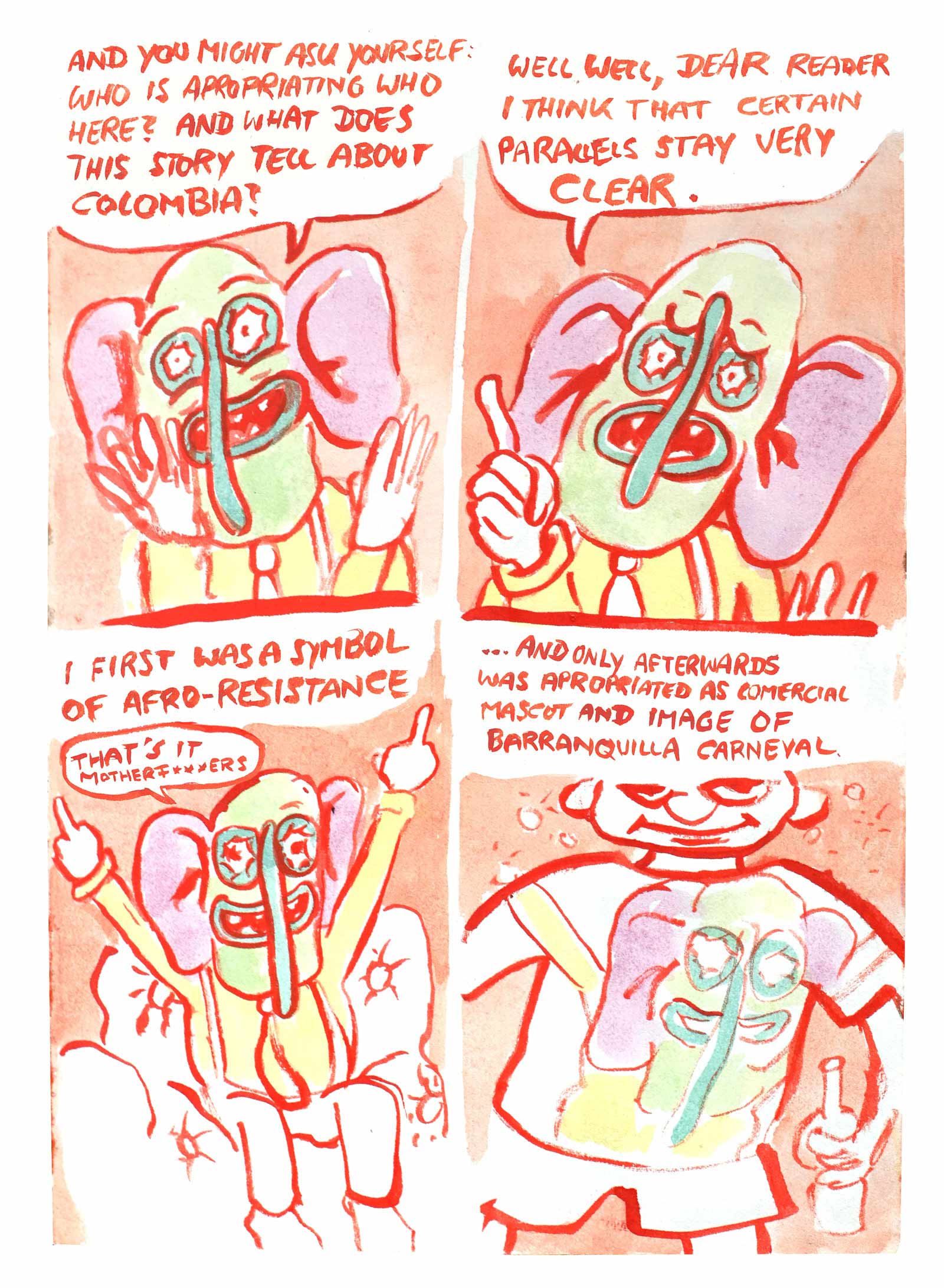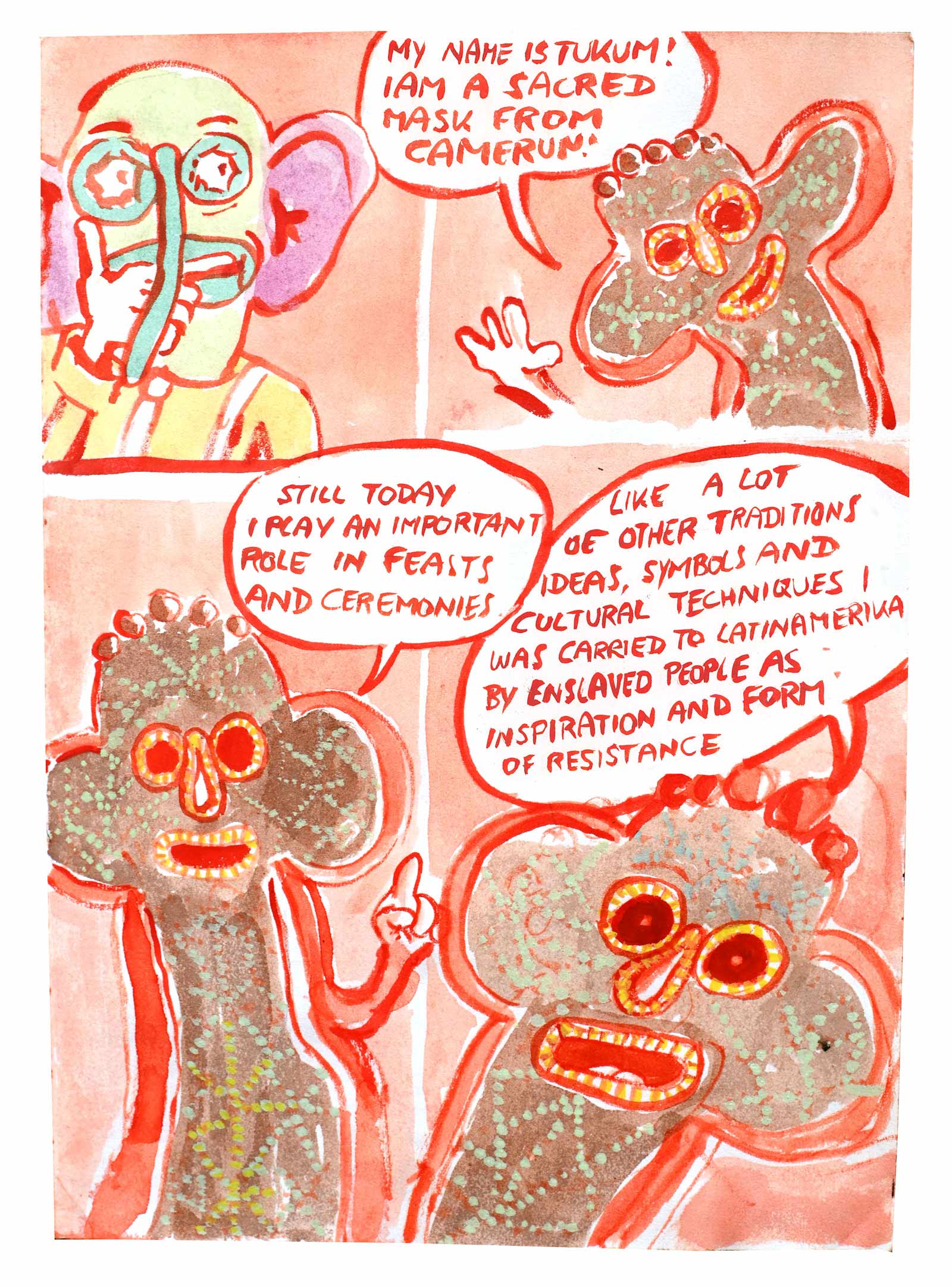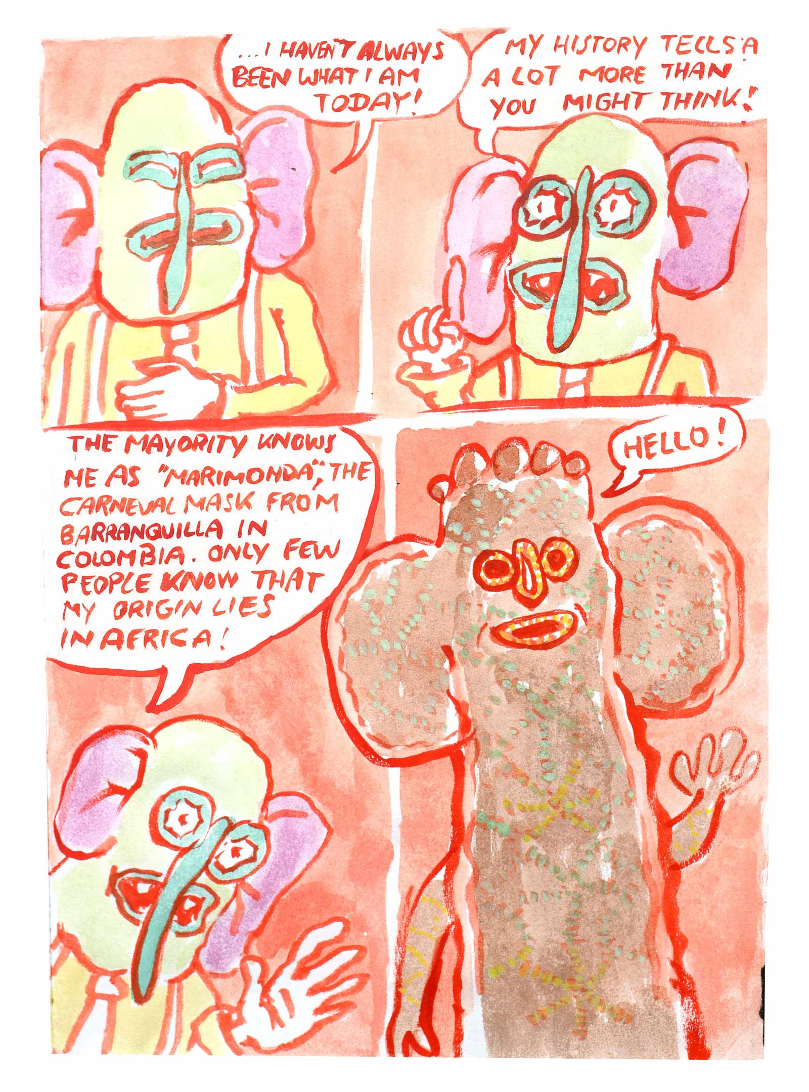 This story is a sequel to Diaz' debut graphic novel OTRAS RAYAS - ANDERE LINIEN, that was published last year in German. The book is about German colonial histories in the Colombian region where his father is from. In this graphic novel there is an intermezzo where the same mask, as deus ex machina, talks about the background of the German colonial history in North East Colombia.This new comic is meant as a polemic in the Colombian context and will be published in Spanish as web-comic. It refers to the history of the mask in the socio-political context of its origin.