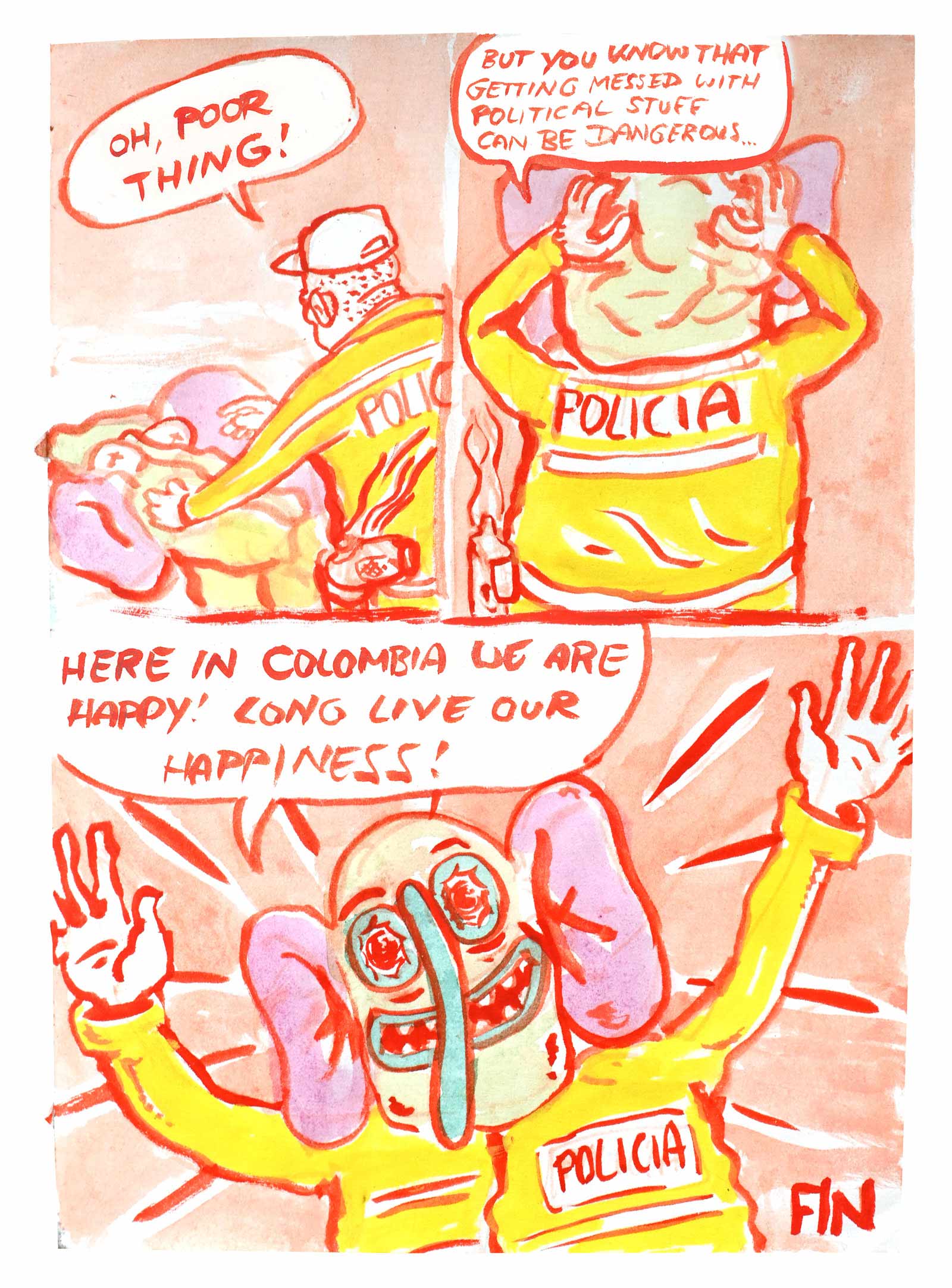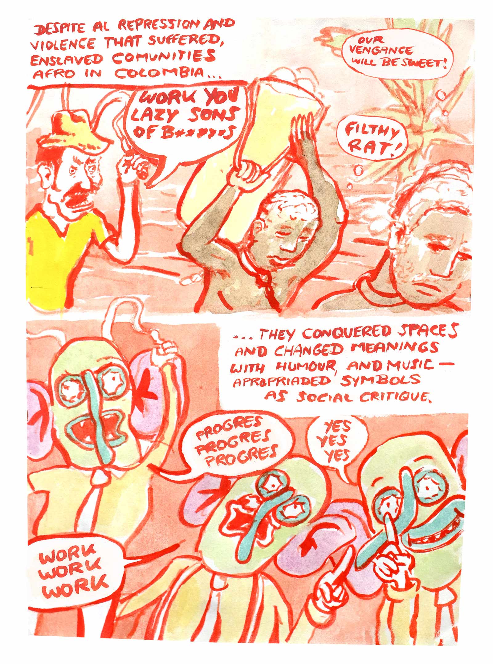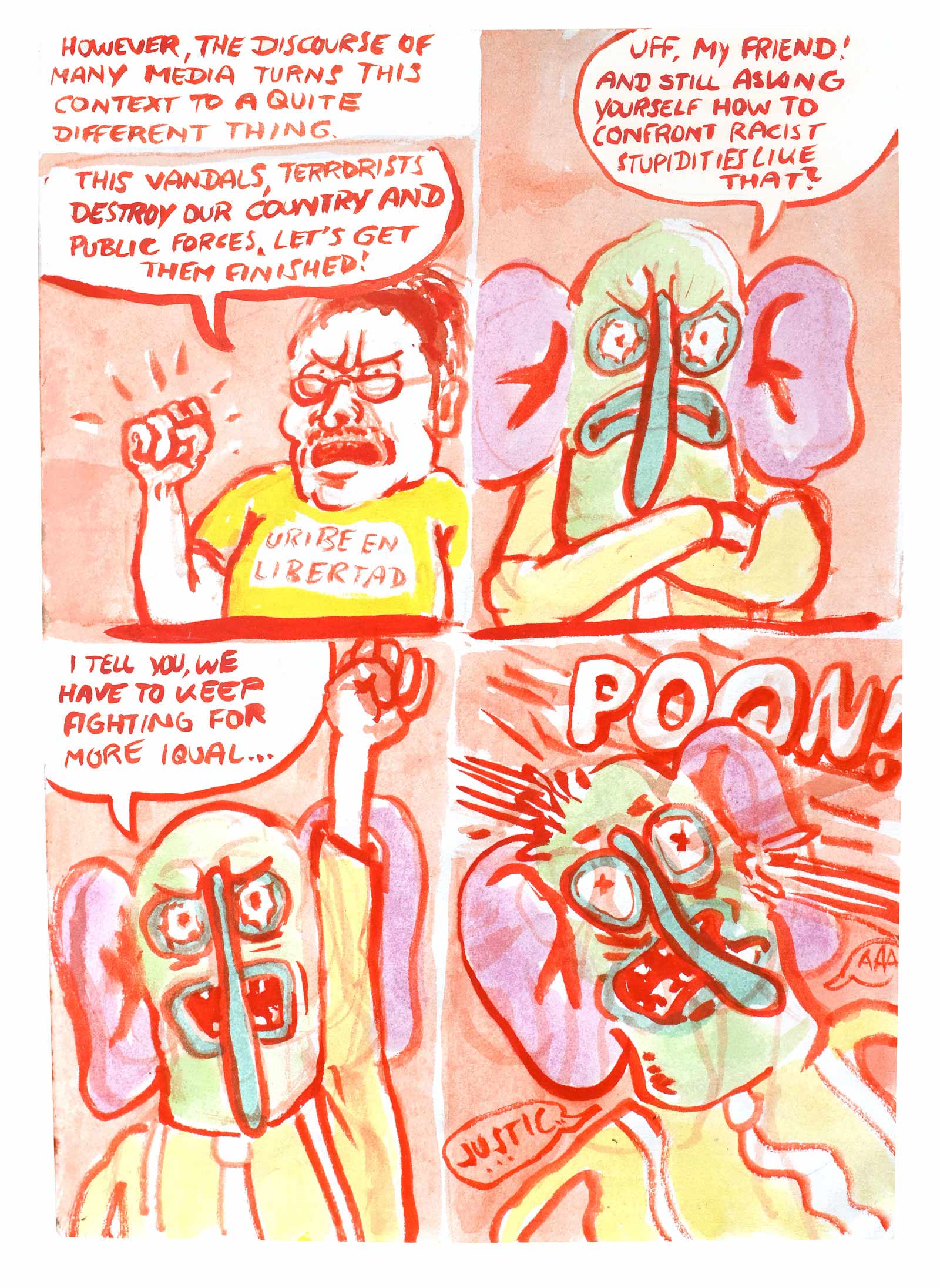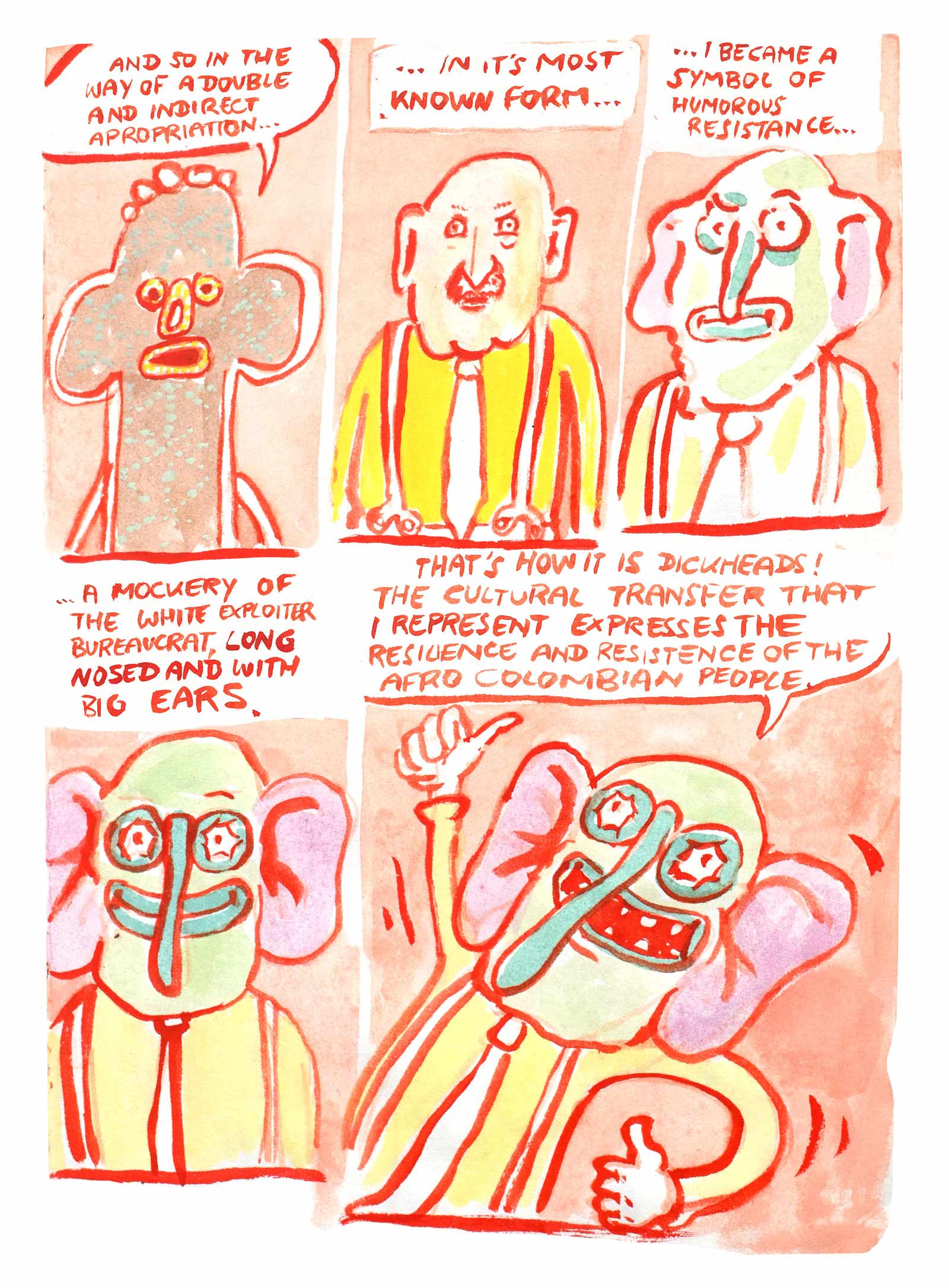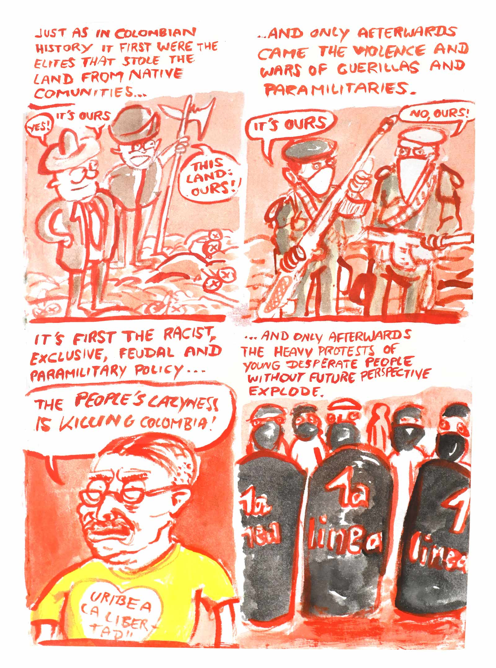This story is a sequel to Diaz' debut graphic novel OTRAS RAYAS - ANDERE LINIEN, that was published last year in German. The book is about German colonial histories in the Colombian region where his father is from. In this graphic novel there is an intermezzo where the same mask, as deus ex machina, talks about the background of the German colonial history in North East Colombia.This new comic is meant as a polemic in the Colombian context and will be published in Spanish as web-comic. It refers to the history of the mask in the socio-political context of its origin.