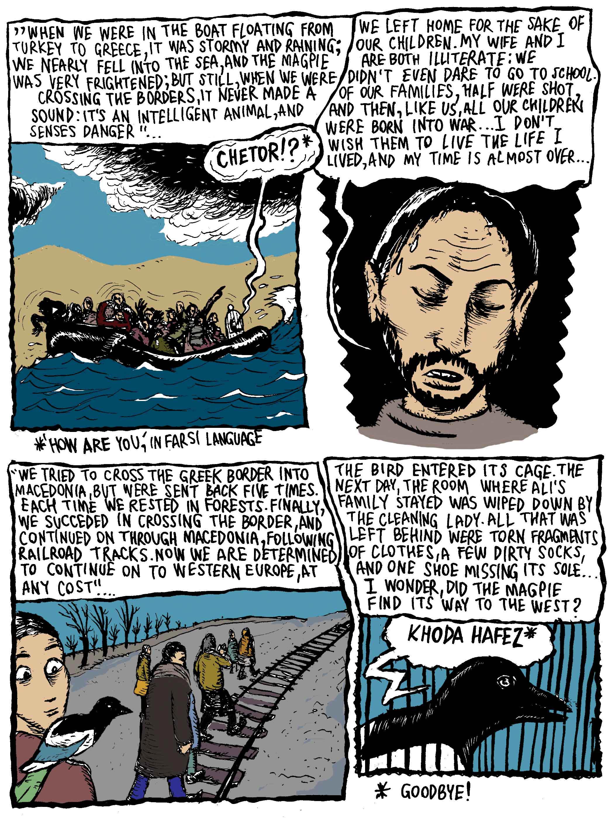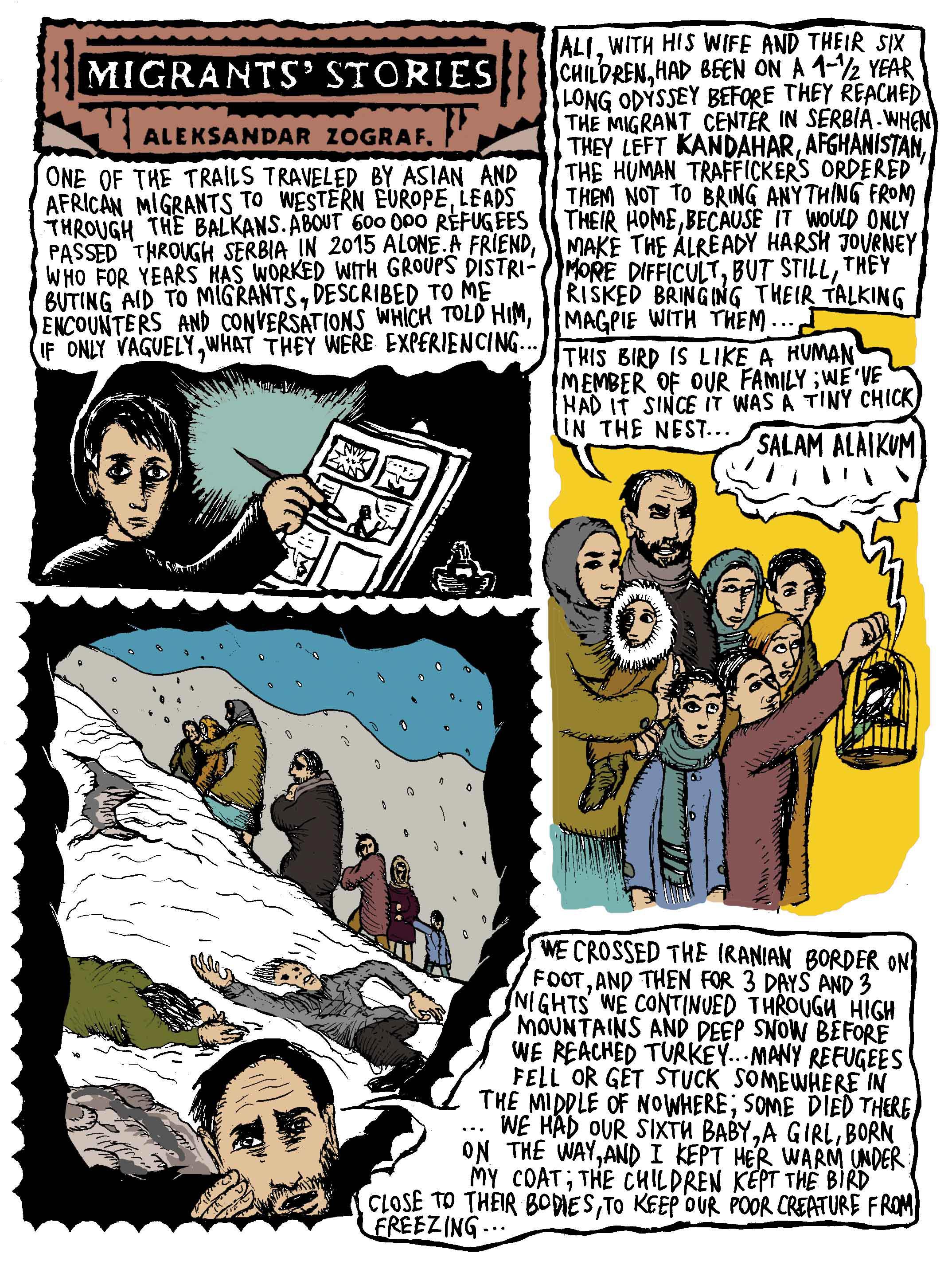 Aleksandar Zograf is a cartoonist from Serbia. The Serbian people suffered from war in the nineties of the last century in their own country, and now migrants from Africa and Asia pass through Serbia in search of a better life. This is the first story in a series of three migrants' stories. Ali is an Afghan who was traveling one-and-a-half year with his wife, his six children and a talking magpie before arriving in Serbia.