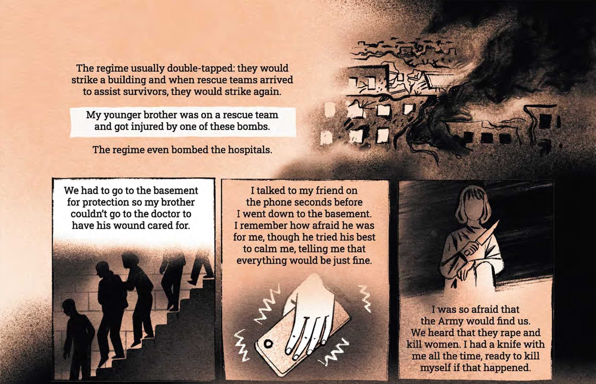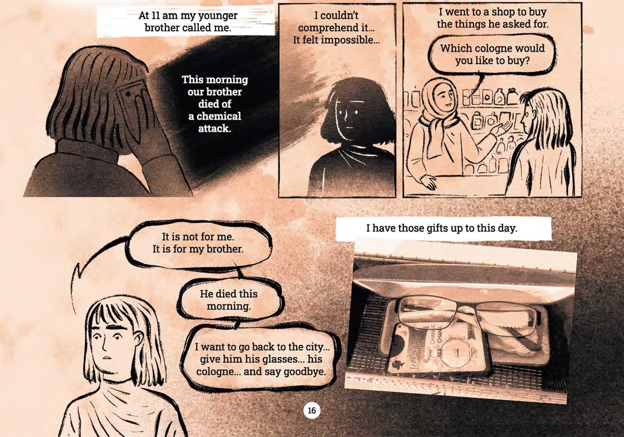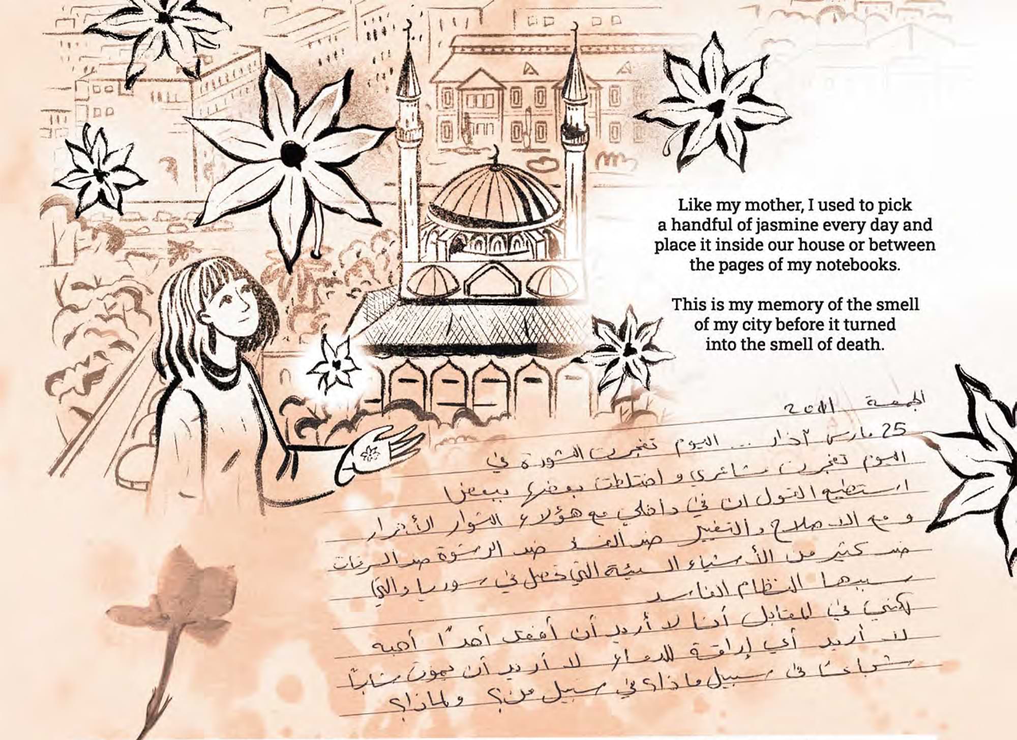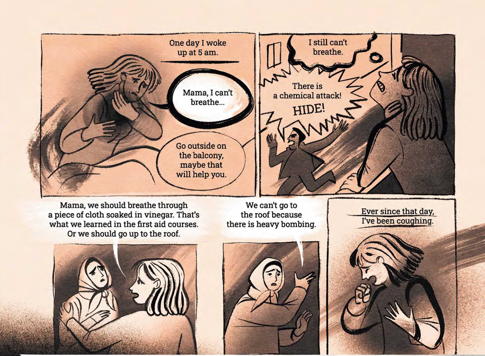 The German/Swiss NGO Libereco previously organized projects in which war histories were incorporated into comics and graphic narratives. The latest project is Scars of Strength. In this project, 14 young people from Ukraine, Iran, Iraq, Syria, and Afghanistan shared their war experiences. This was done as an oral history project called "To tell OUR stories: youth memories on refuge and resilience" Due to the topicality of recent affairs in Syria, we chose to publish My Jasmine Diary. It is an eyewitness story by the Syrian Inanna, about a chemical attack during the first phase of the fight against the Assad regime. The illustrations are made by the Ukrainian artist Sofiia Runova.