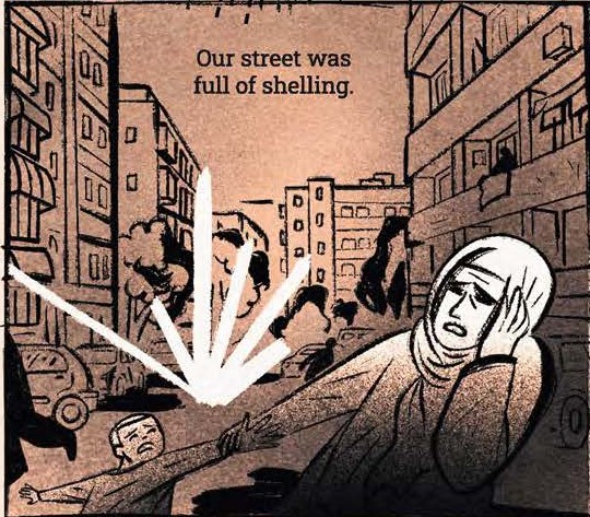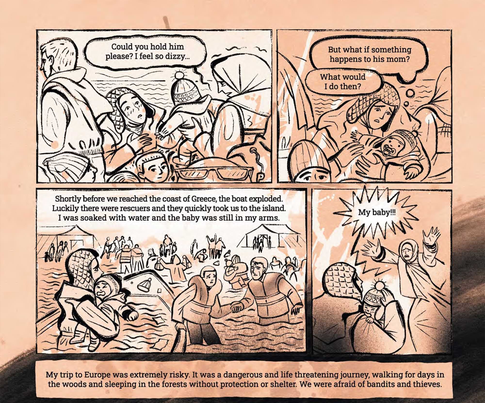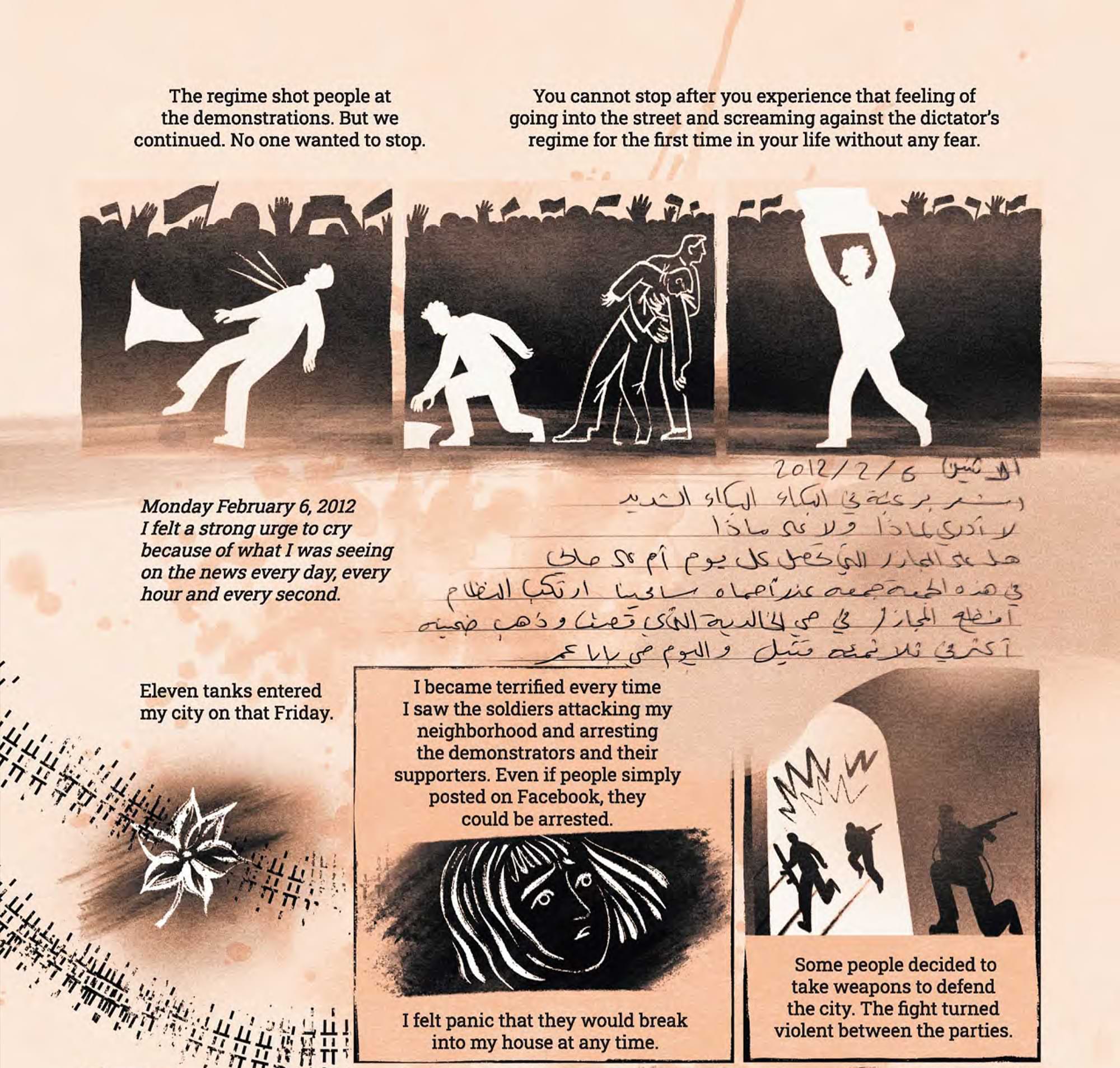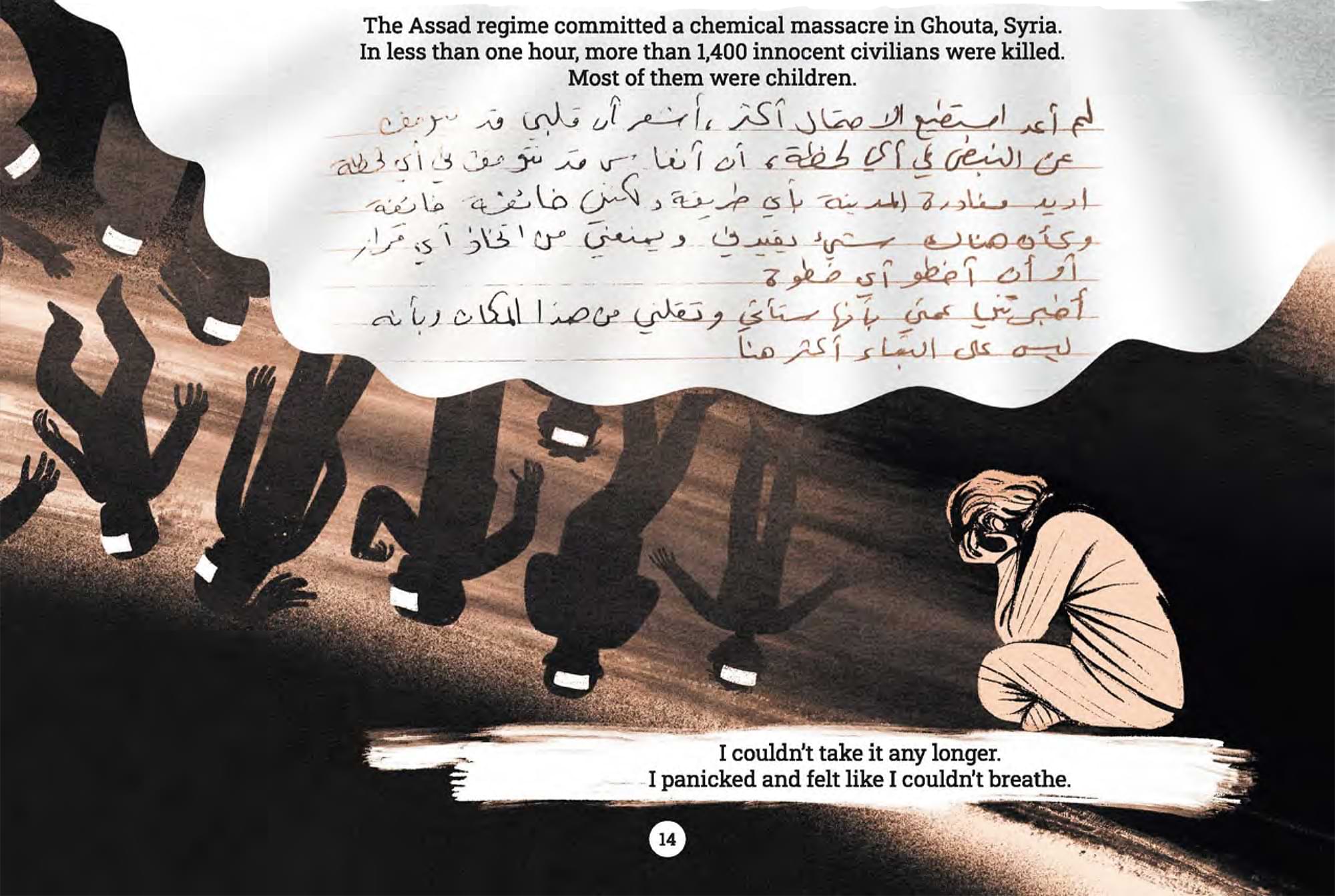 The German/Swiss NGO Libereco previously organized projects in which war histories were incorporated into comics and graphic narratives. The latest project is Scars of Strength. In this project, 14 young people from Ukraine, Iran, Iraq, Syria, and Afghanistan shared their war experiences. This was done as an oral history project called "To tell OUR stories: youth memories on refuge and resilience" Due to the topicality of recent affairs in Syria, we chose to publish My Jasmine Diary. It is an eyewitness story by the Syrian Inanna, about a chemical attack during the first phase of the fight against the Assad regime. The illustrations are made by the Ukrainian artist Sofiia Runova.