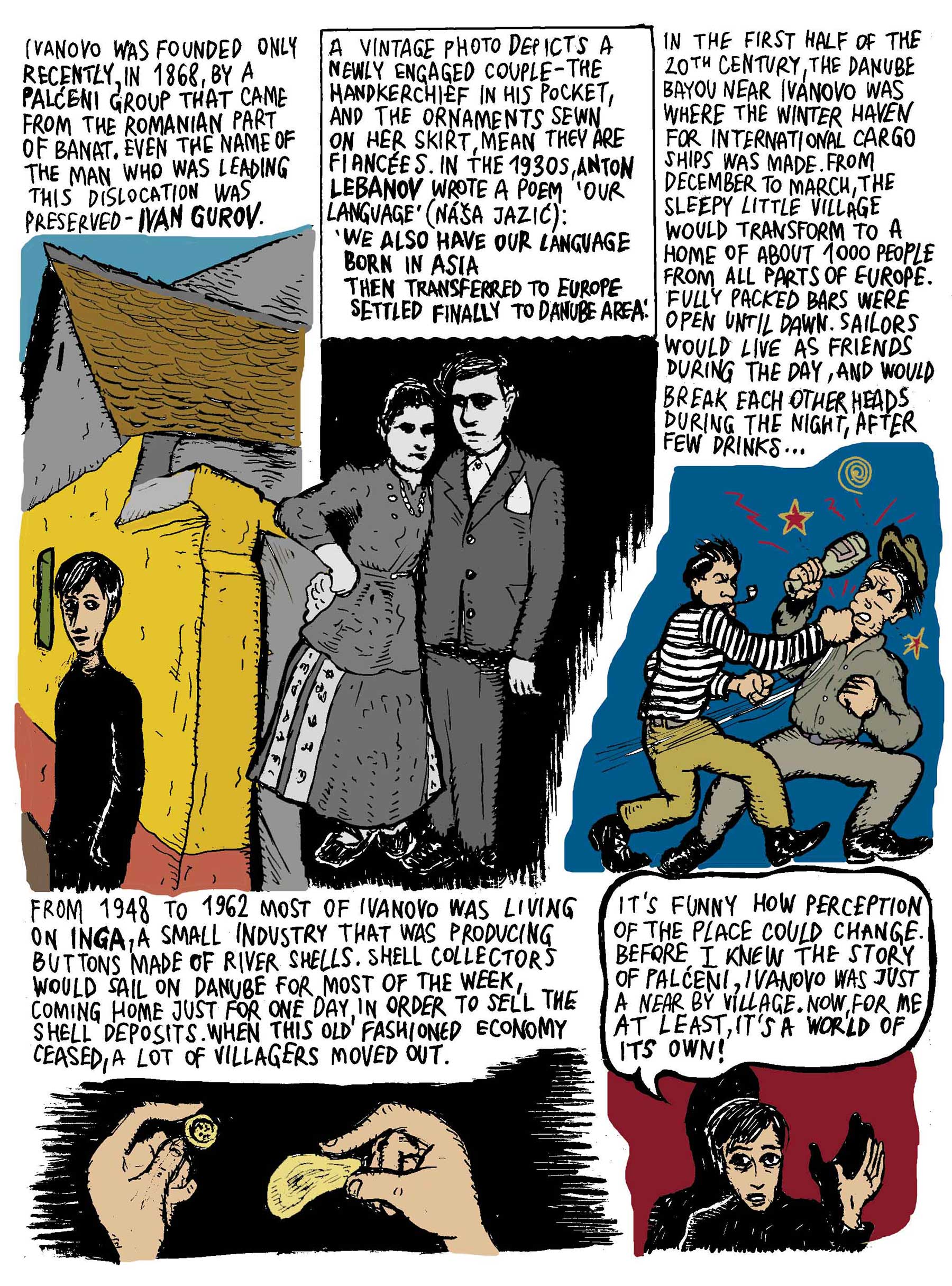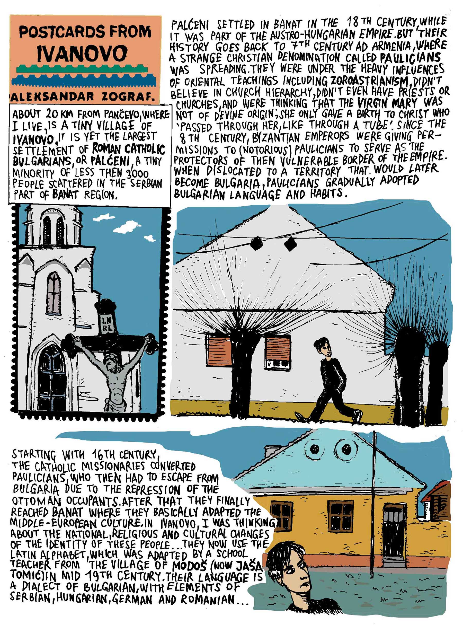 About 20 km from the Serbian city of Pančevo, where the author Aleksandar Zograf lives, lies the tiny village of Ivanovo. It is the largest settlement of Roman Catholic Bulgarians, the Palćeni. The Palćeni is a small minority of less than 3000 people scattered in the Serbian Banat region. This story was originally published in the Italian magazine Internazionale and it was shown at the Nova Festival in Pančevo in the exhibition: European Cultural Heritage Through Comics, in October 2018.