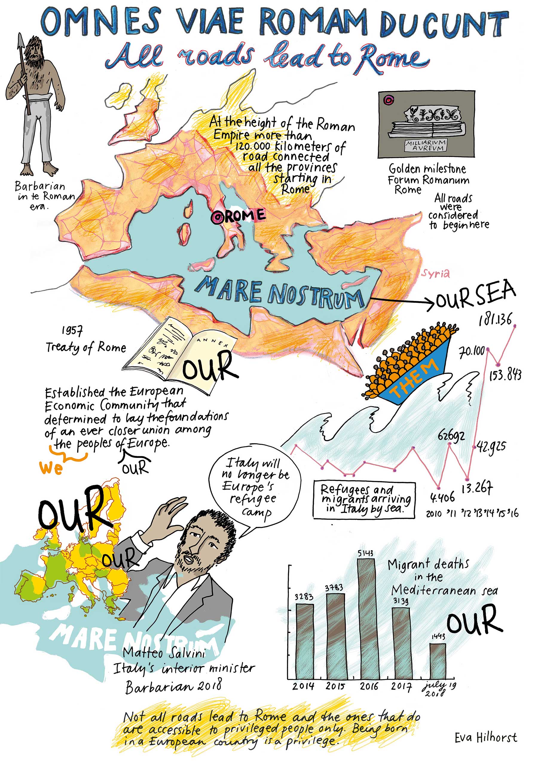 Eva Hilhorst made this story about the golden milestone in Rome, where all roads of the Roman Empire were considered to begin. She compared the saying: All roads lead to Rome to its meaning today. It was shown at the Nova Festival in Pančevo in the exhibition: European Cultural Heritage Through Comics, in October 2018.