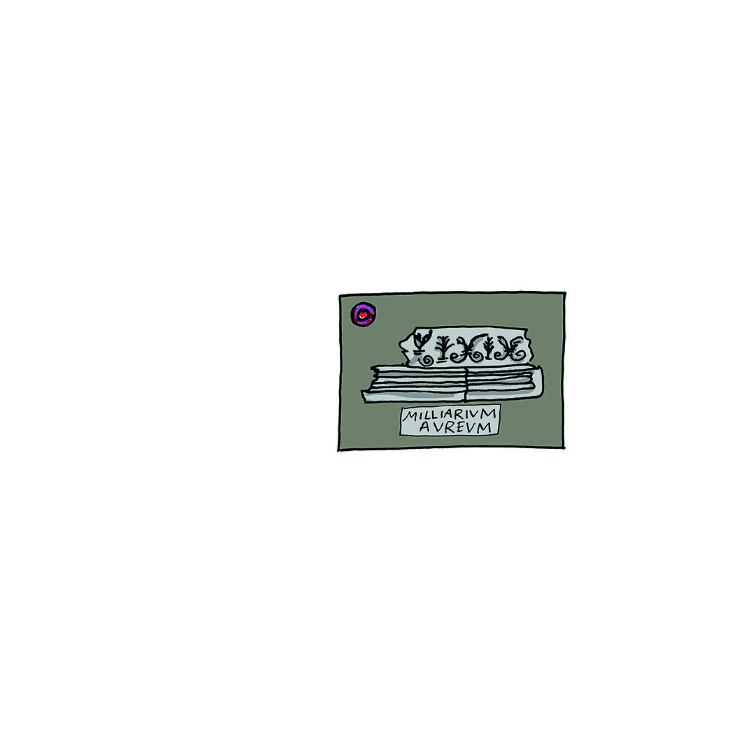 Eva Hilhorst made this story about the golden milestone in Rome, where all roads of the Roman Empire were considered to begin. She compared the saying: All roads lead to Rome to its meaning today. It was shown at the Nova Festival in Pančevo in the exhibition: European Cultural Heritage Through Comics, in October 2018.