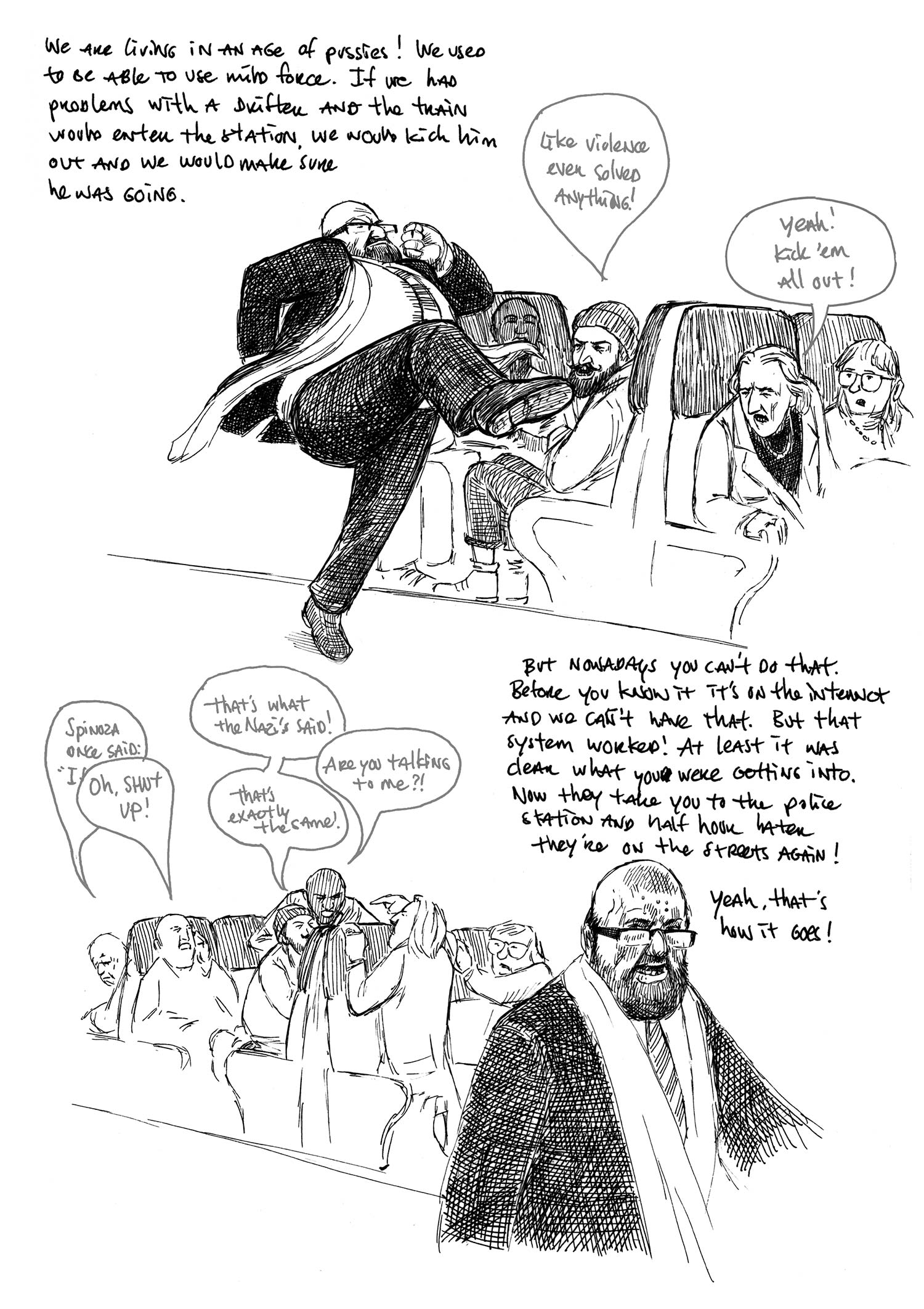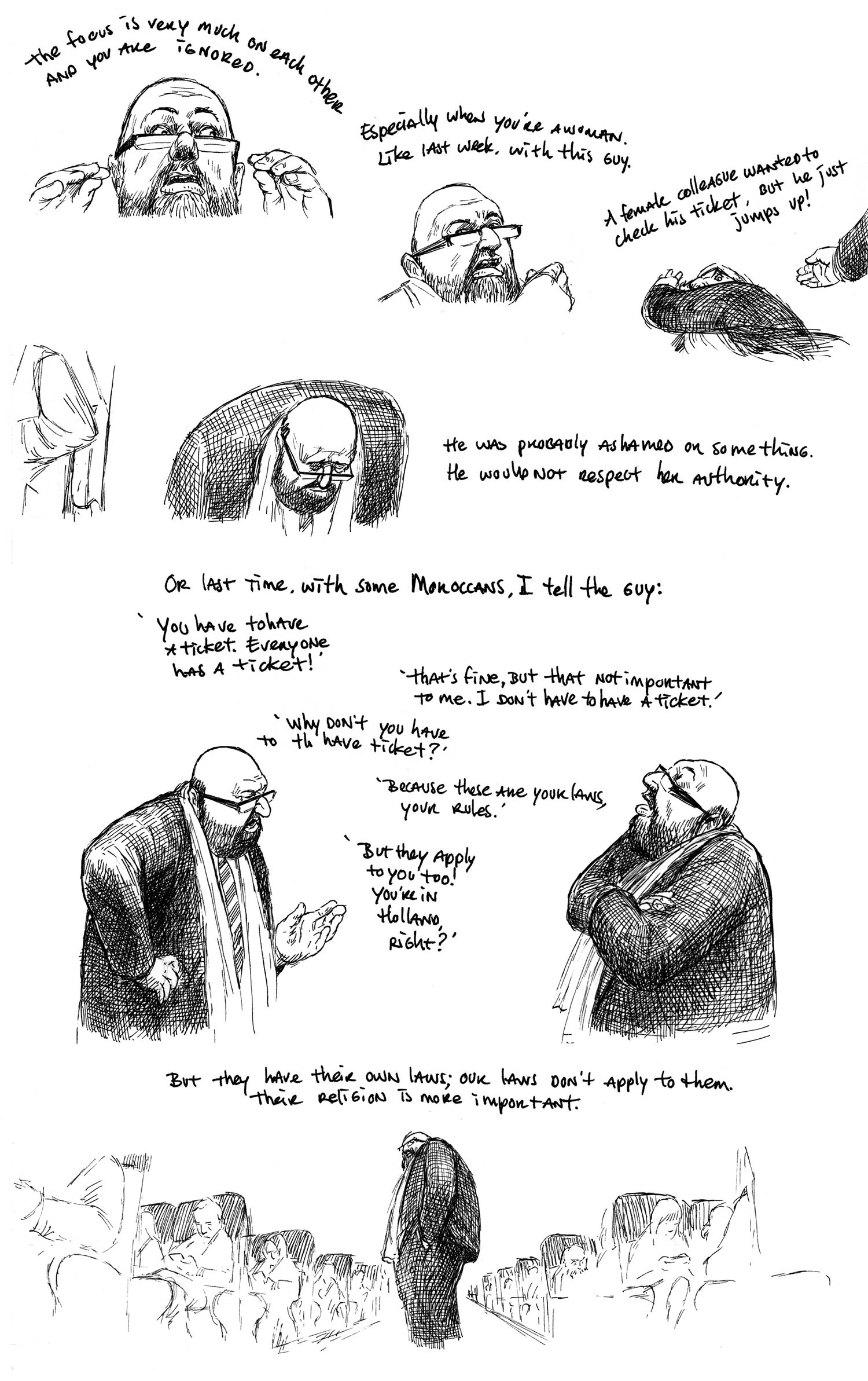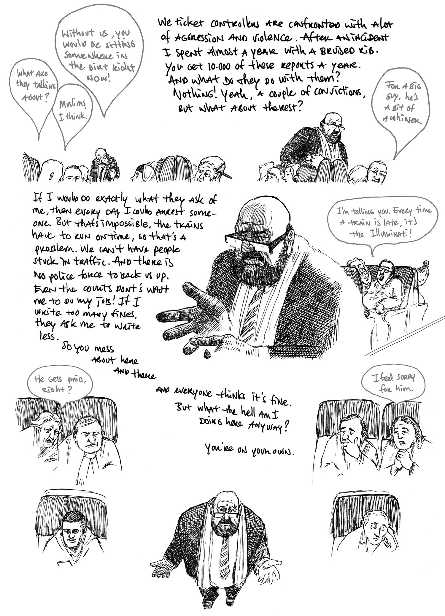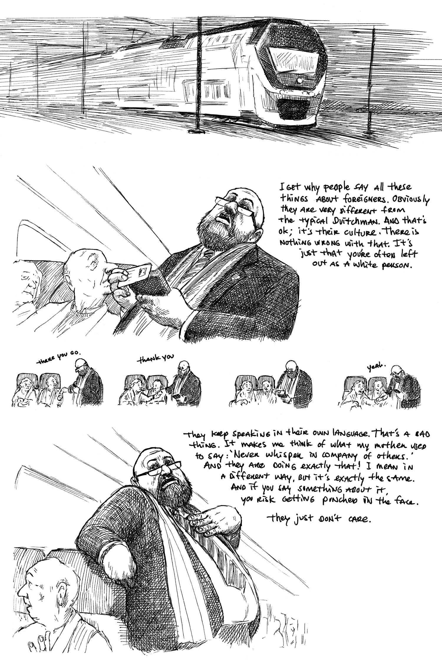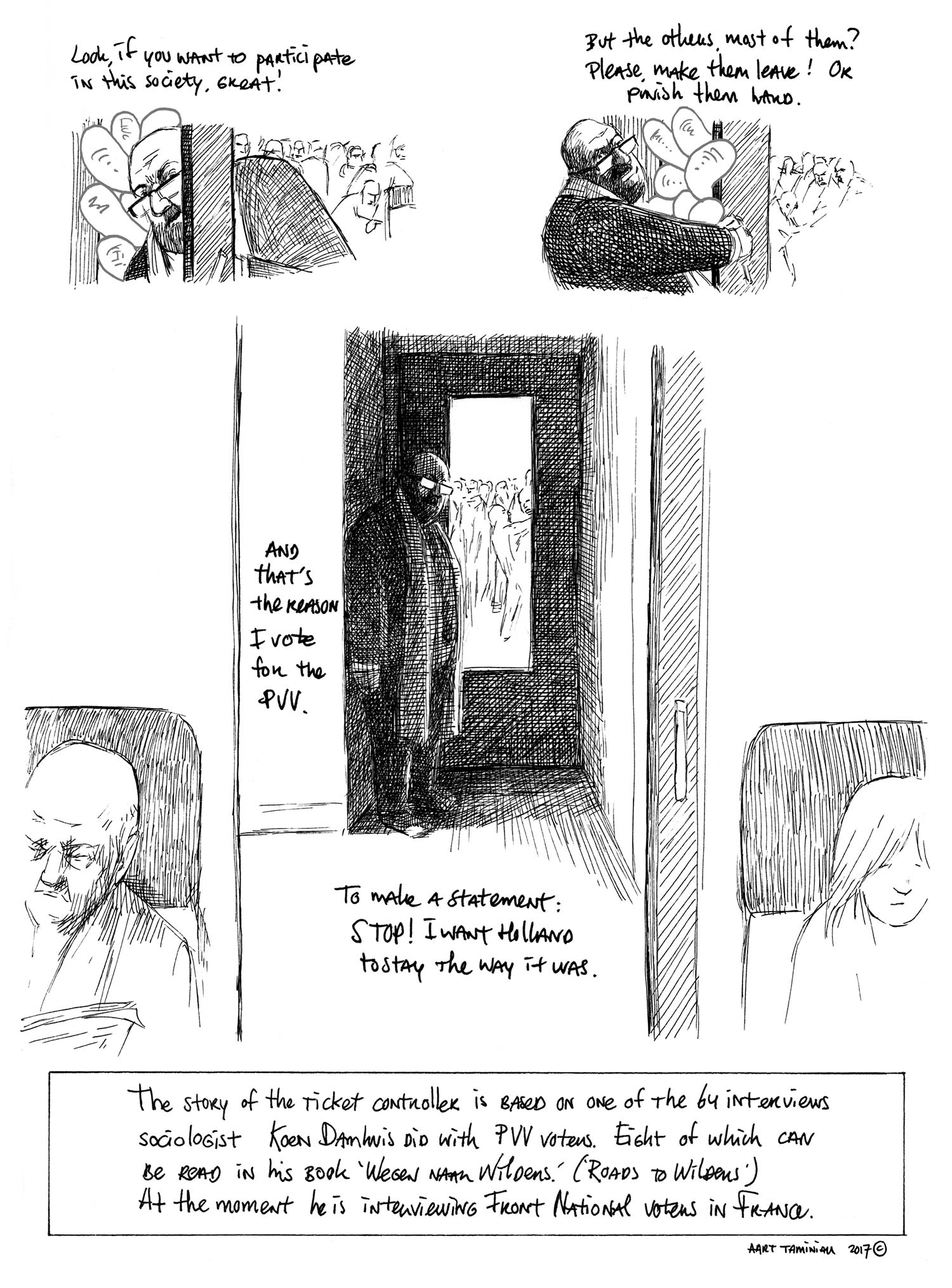 The story of the ticket controller is based on one of the 64 interviews sociologist Koen Damhuis did with PVV voters. Eight of which can be read in his book Wegen naar Wilders (Roads to Wilders). At the moment he is interviewing Front National voters in France.